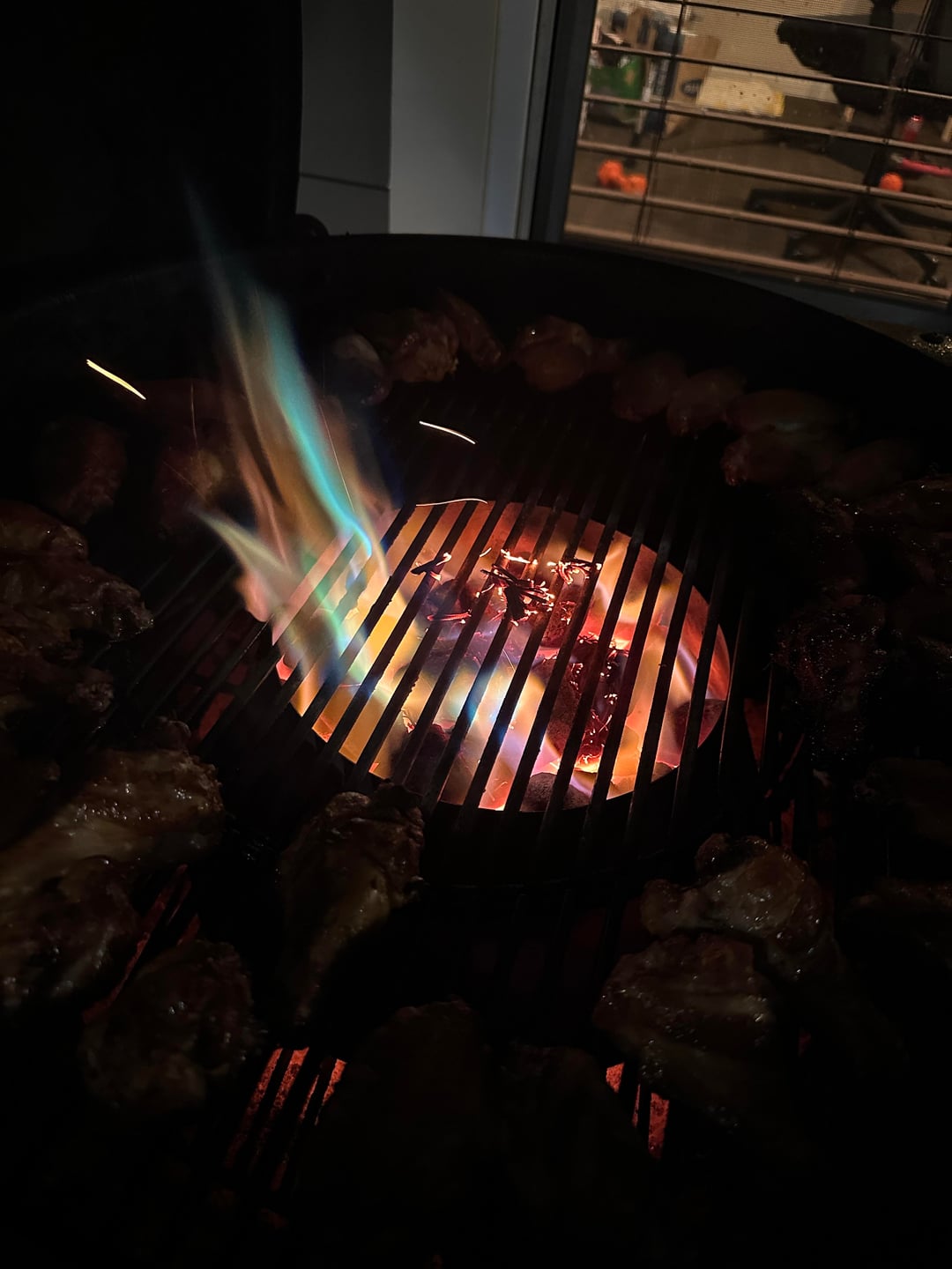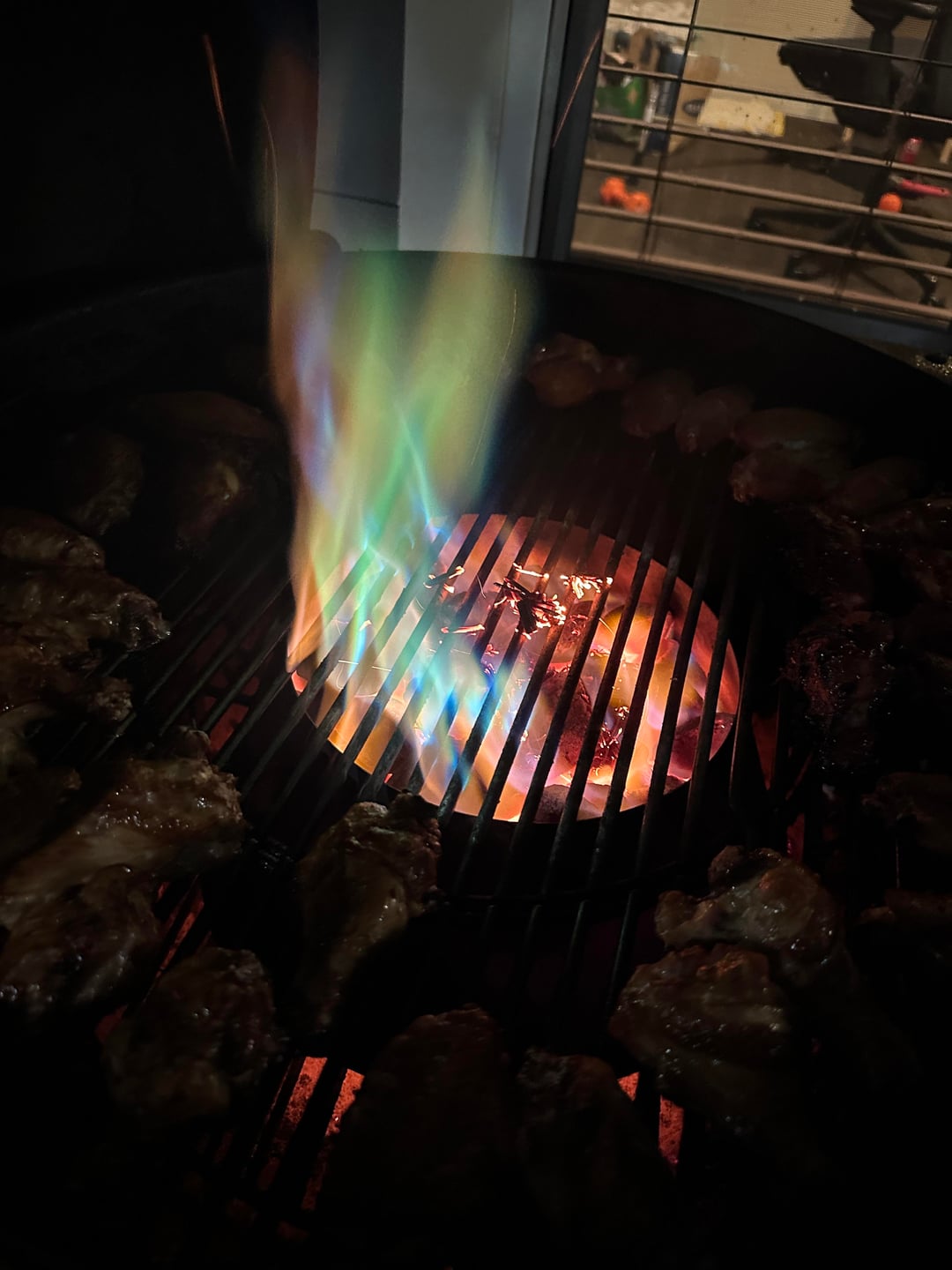 It’s a vortex but not home made. Amazon. It doesn’t seem like it’s coming from the vortex though. Almost like it’s coming from the grate bar. I’m gunna run a test with charcoal only no grate, then grate, then the chips I used. The chips came from smokenlicious. Ma and pa shop. See if I can isolate where it’s coming from. Use Weber stainless steel brush. Don’t use cleaners, and always used Kingsford. Only new thing is those chips. (Well used them before)