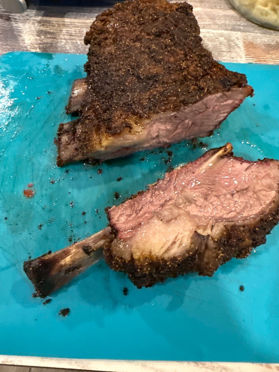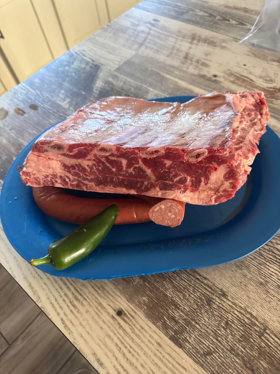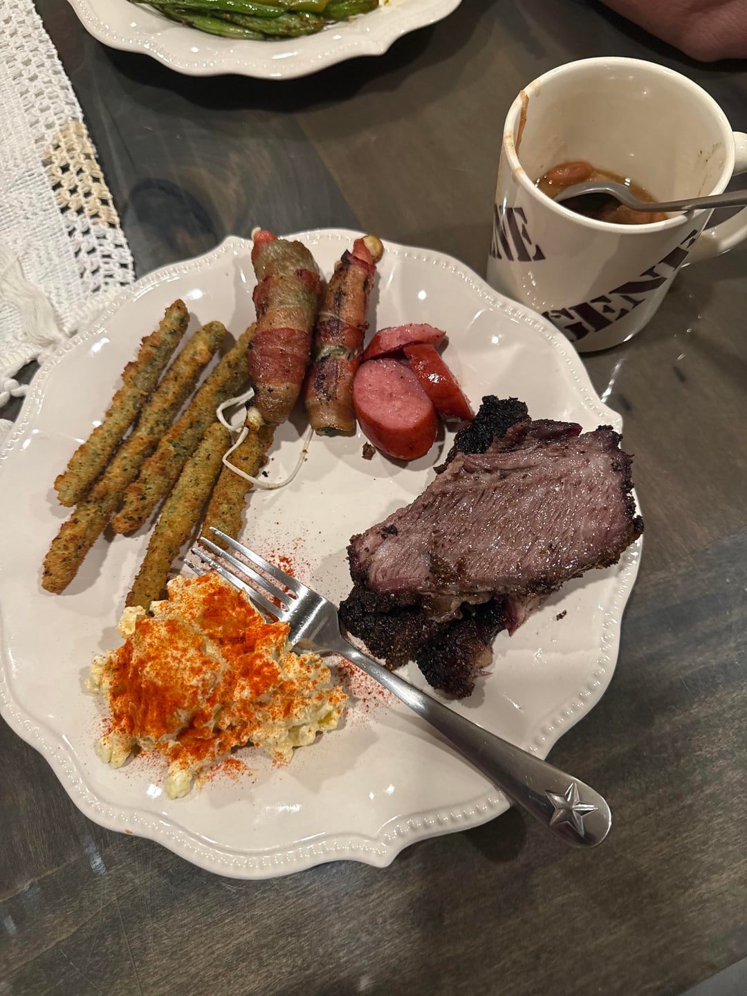 I finally put some beef ribs on the pit, about 5lbs rack, seasoned with just coarse pepper, garlic & onion granulated (not powder) & sea salt, smoked on pit boss @250° for about 6.5hrs, then rested. Ribs were tender, juicy and had good flavor. Made a plethra of sides, pinto beans, tater salad with newly added chick fila sauce(yummy), poppers and some cheap kiobassa sausage. Had the daughters & grand kids over, def will do it again👍