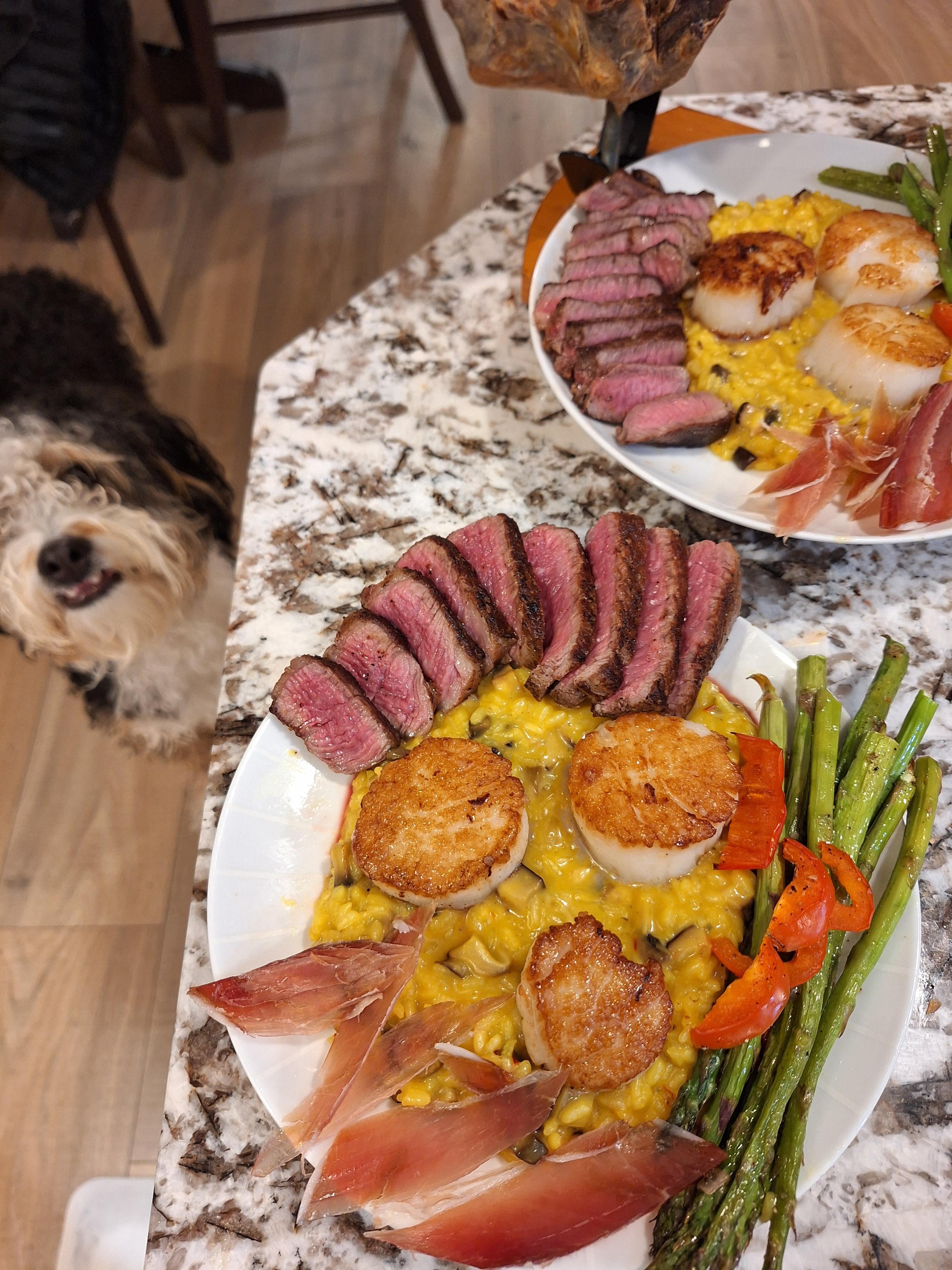 Steak, scallops, dry jamon, saffron mushroom risotto, and asparagus [homemade]