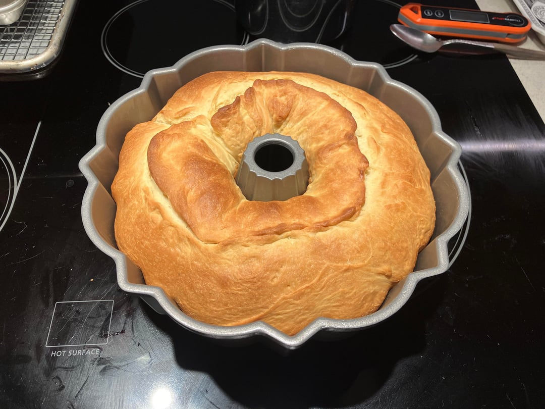 It was all going so well, until it wasn’t, and I ended up with a gorgeous technicolor drip pan. Cake is brioche-ish with a sweetened cream cheese swirl. No baby on hand, I’m afraid.