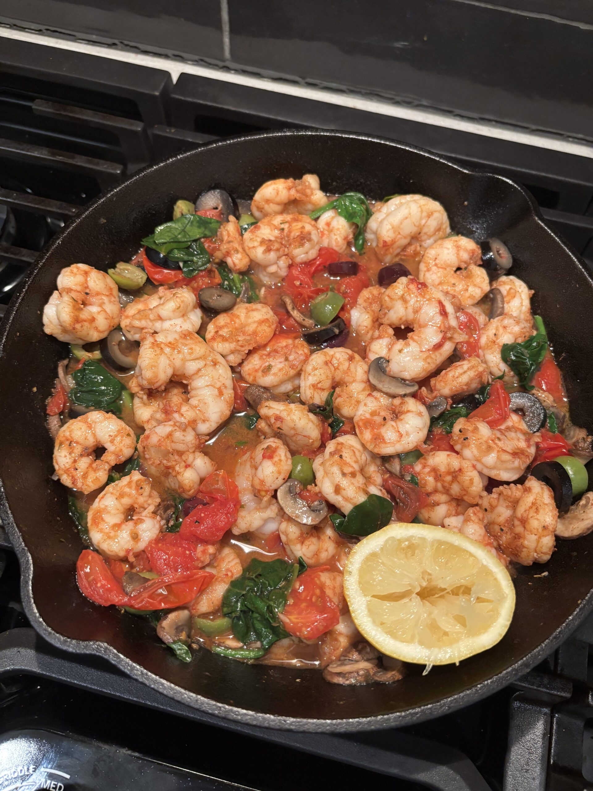 MD serving size for shrimp is be 3-4 oz, so 1.5 pounds of shrimp would be about 6 servings. There doesn’t look to be enough veggies for 6 servings. So… maybe either add more veggies or have some additional ones on the side. Also a side of whole grain (brown rice, quinoa, whole wheat bread, whole grain pasta, etc.) would round things out nicely.