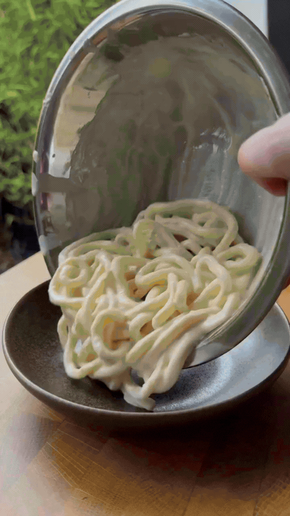 1. Cook the noodles according to the packet instructions, then combine with the silken tofu sauce in a mixing bowl and stir well with a chopstick, moving the bowl around to help cover the noodles in the sauce.
