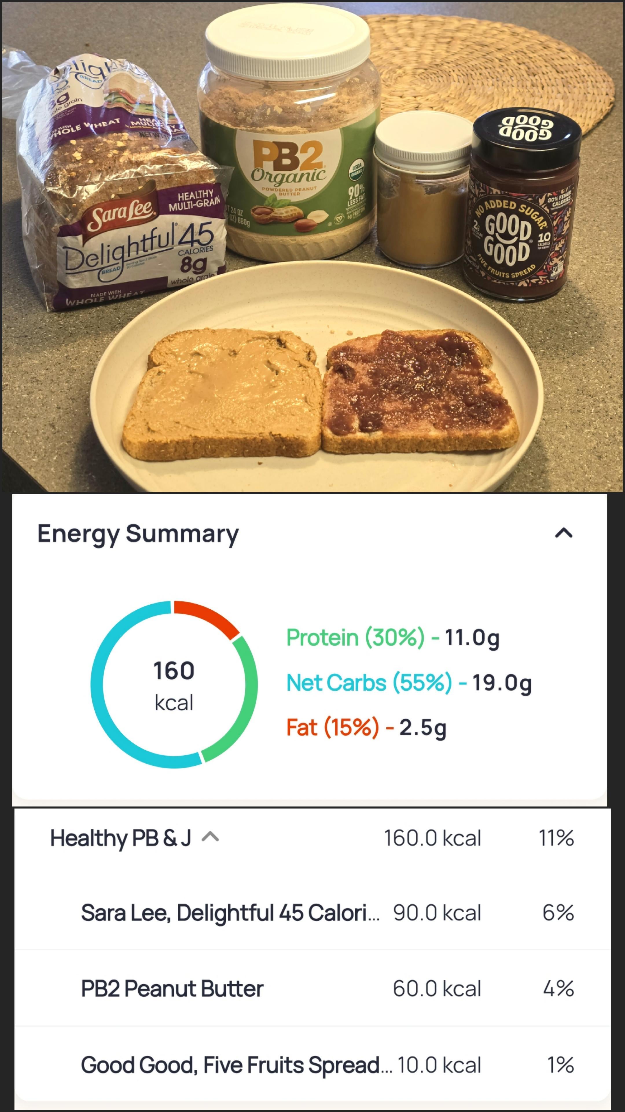 Go_4_The_Optics 3 weeks ago I do basically the same thing as my pre-cardio snack. One slice of Delight 45, one serving of regular PB2 but I do peach jelly. So good.
