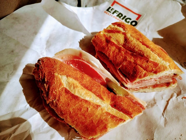 The shop only has a couple of tables, so I always get one of the ready-made sandwiches. Besides classics like Le Frigoâs Royale, the board also offers Le Deviled, essentially a deviled egg and bacon sandwich on a baguette, and Le Au Jus, a fine toasted roast beef and Swiss with French onion soup for dipping.