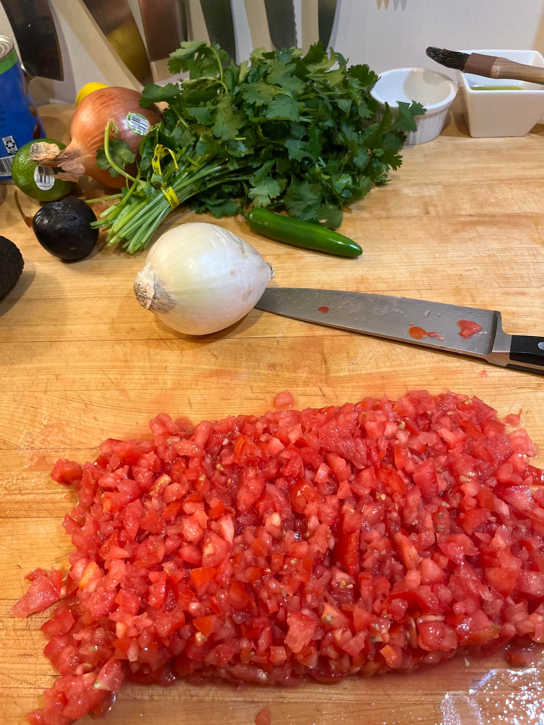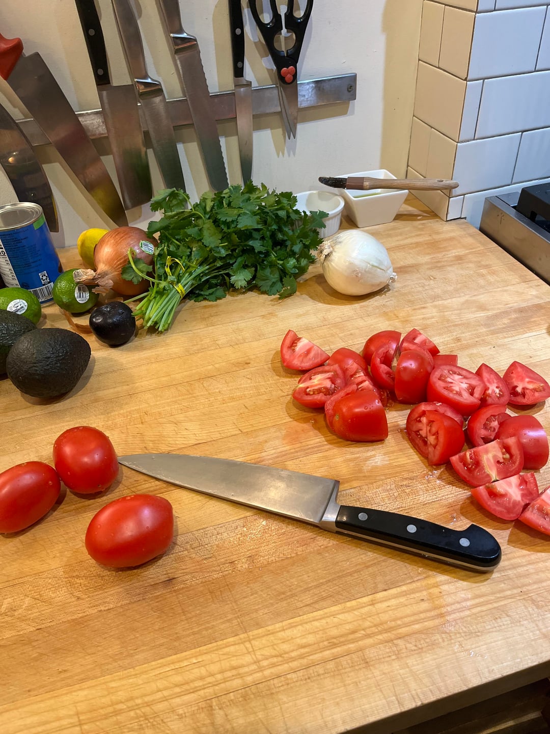 Dice 8 Roma tomatoes, 1.5 small white onions, half a bunch of cilantro, 1 diced Serrano, juice of 1.5 lines and sea salt to taste. Toss, taste, adjust. I like to refrigerate for one hour before serving.