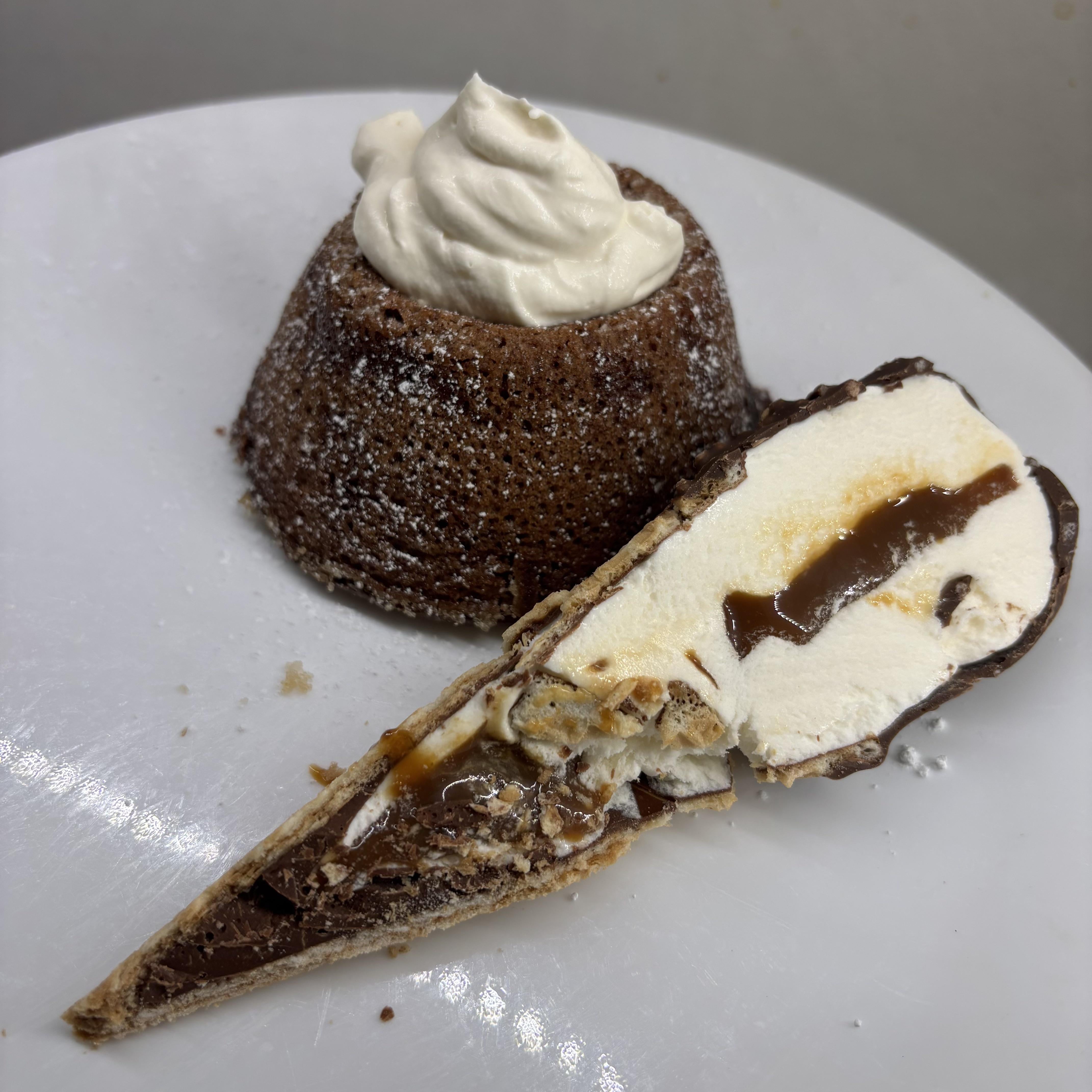Chocolate Lava Cake with homemade whipped & a drumstick on the half shell