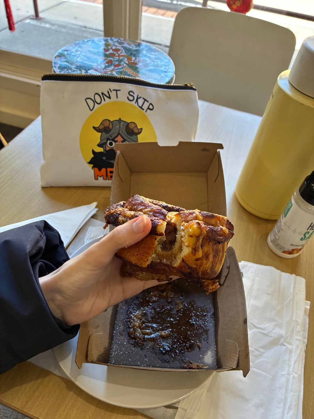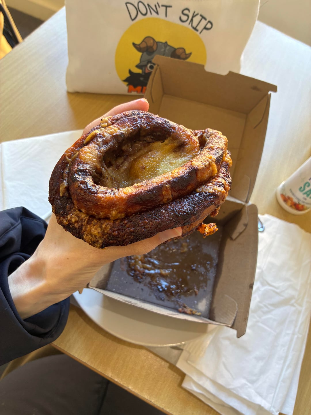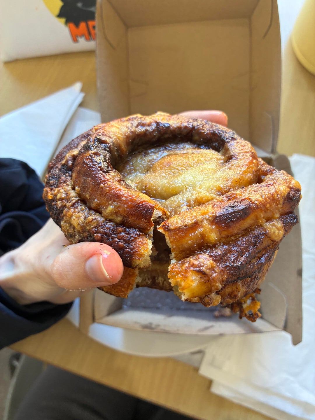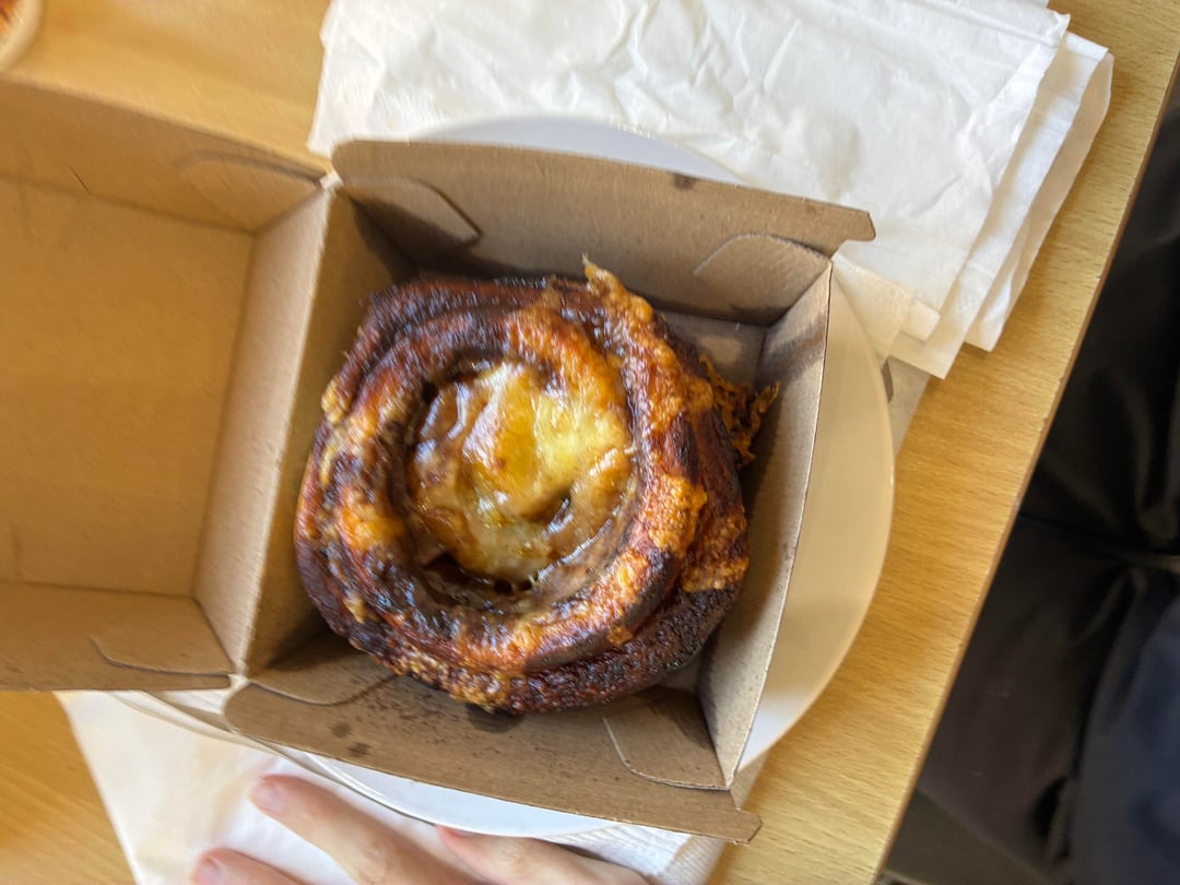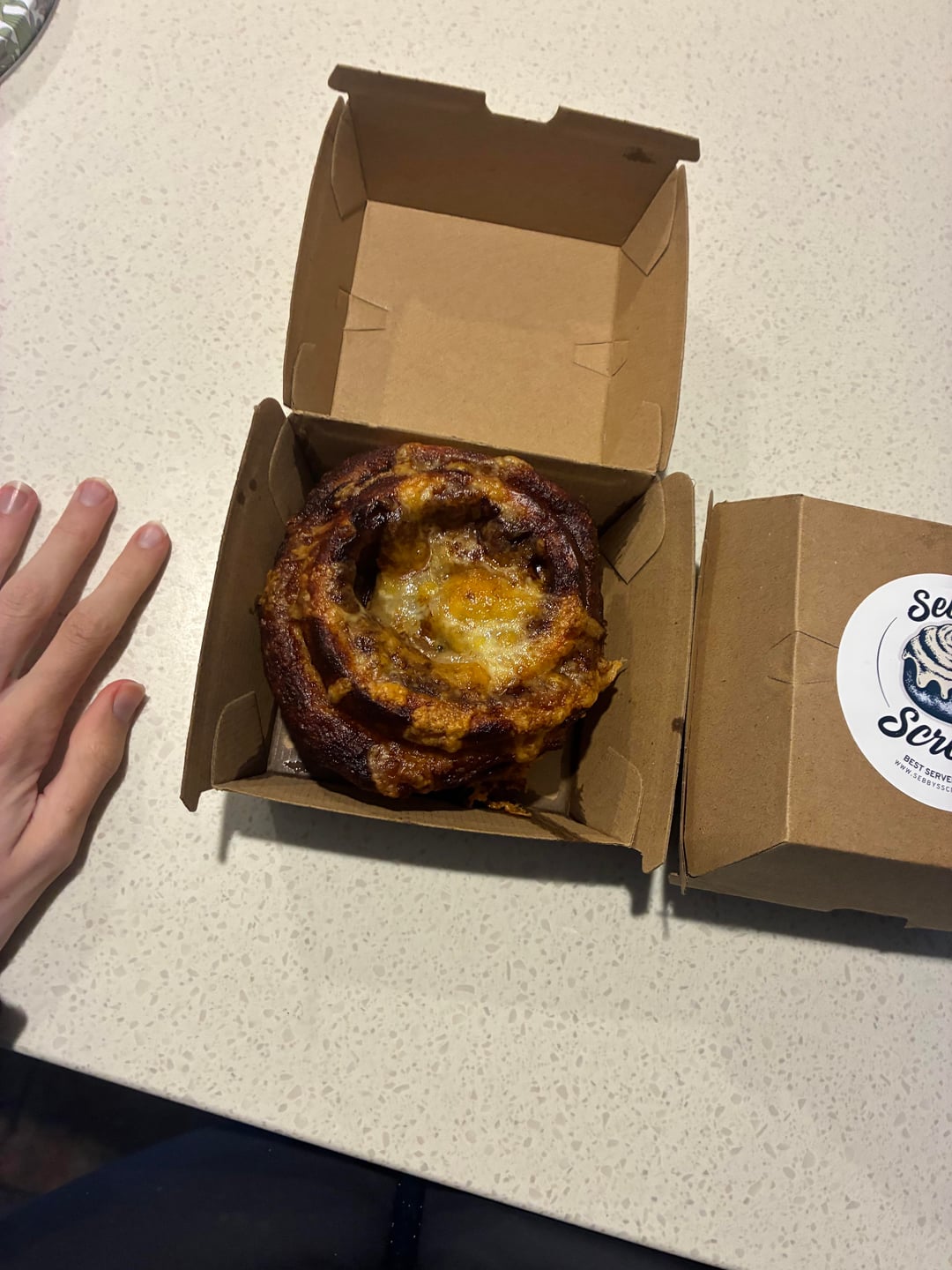 That thing is massive 😅 Looks like a loaded vegemite + cheese scroll with a lot of butter/oil. Rough breakdown: enriched dough ~300–350 calories per 100g, cheese + butter filling easily adds another ~150–200 per 100g. For a scroll that size (probably 350–450g total), you’re likely looking at around 1,400–1,800 calories for the whole thing. Even a quarter would still be a solid 350–450 calories. I usually sanity-check stuff like this by logging dough and filling separately in my tracker since bakery portions are all over the place.