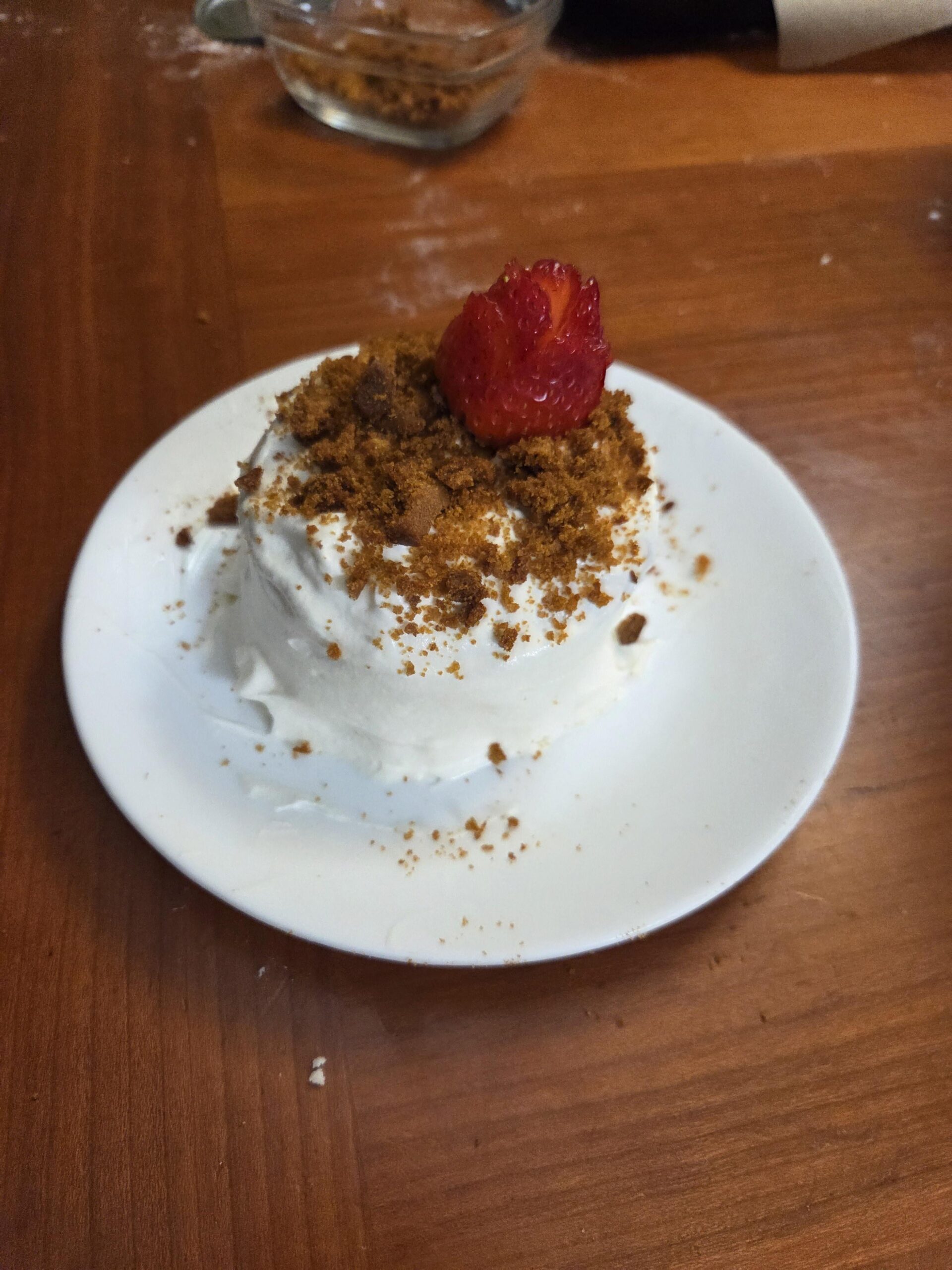 5. Garnish. It's traditional to coat the cake in the crumbs of the scrap, but you can do whatever you like so long as it makes it prettier/tastier. I put a strawberry rose on my first one!