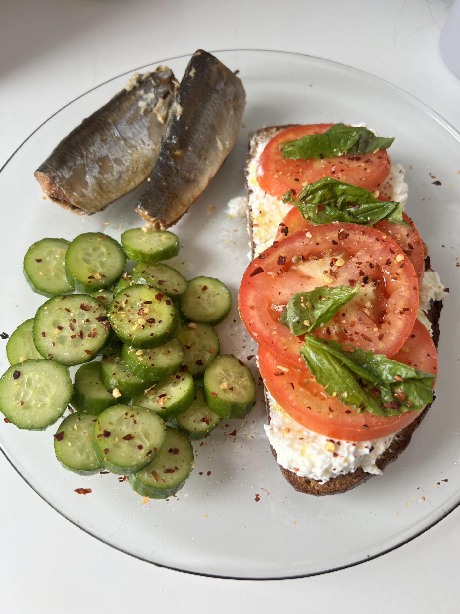 Tomato, basil, olive oil and whipped cottage cheese on sourdough with cucumbers and sardines!
