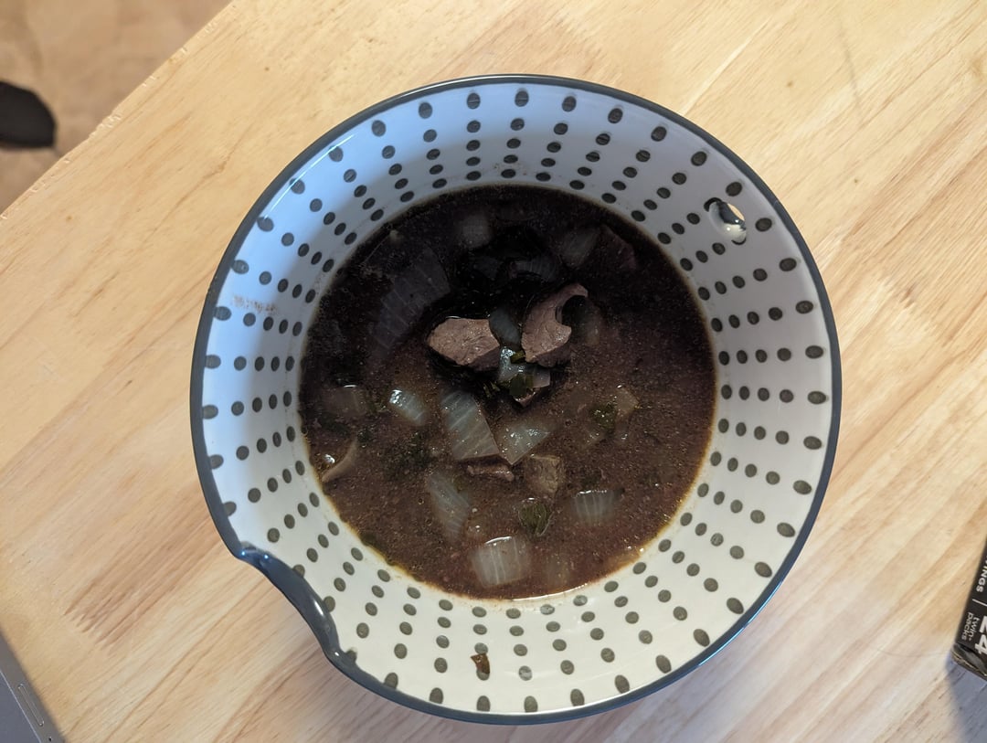 5. Cube beef heart into like 1 inch cubes. Dump into bowl of salted iced water and squidge around to get any leftover blood or clots out of the tissue. Plop into a covered casserole with an equal amount of large chunk onions [I suppose pearled onions would work] a few whole garlic cloves, a suitable to taste amount of italian herbs, coarsely cracked black pepper, salt if you feel the need and add red wine to cover. Cover, bake low and slow – 250*f for 4 to 6 hours. Serve over potato dumplings, noodles, rice, whatever starch you like. Add a nice side salad and a piece of cheesecake for dessert.