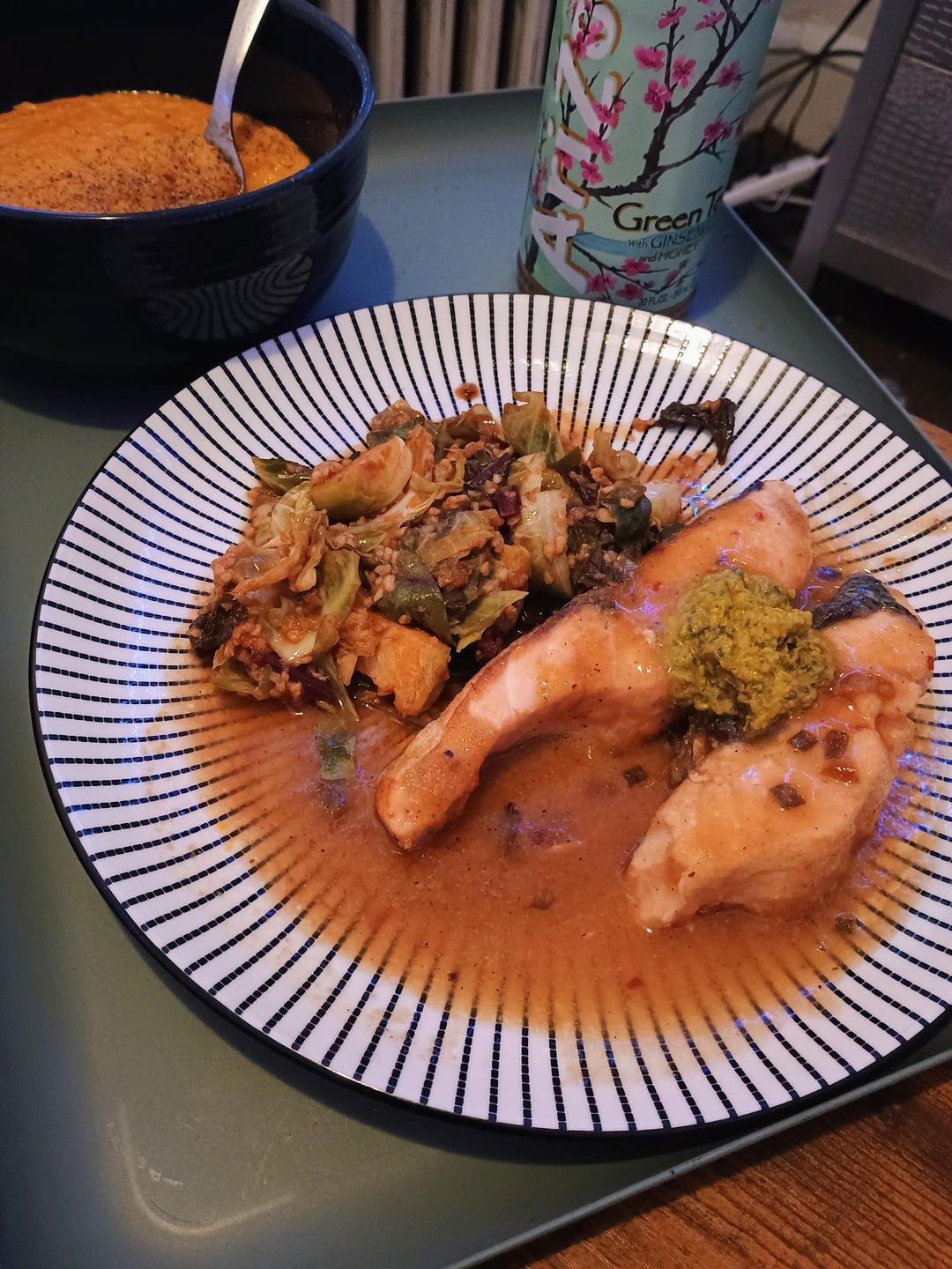 Pan seared salmon with garnished with pesto and a bowl of 5 spice cheese grits by sparkMagnus9 1 Comment Fuzzy_Welcome8348 1 week ago Looks good!