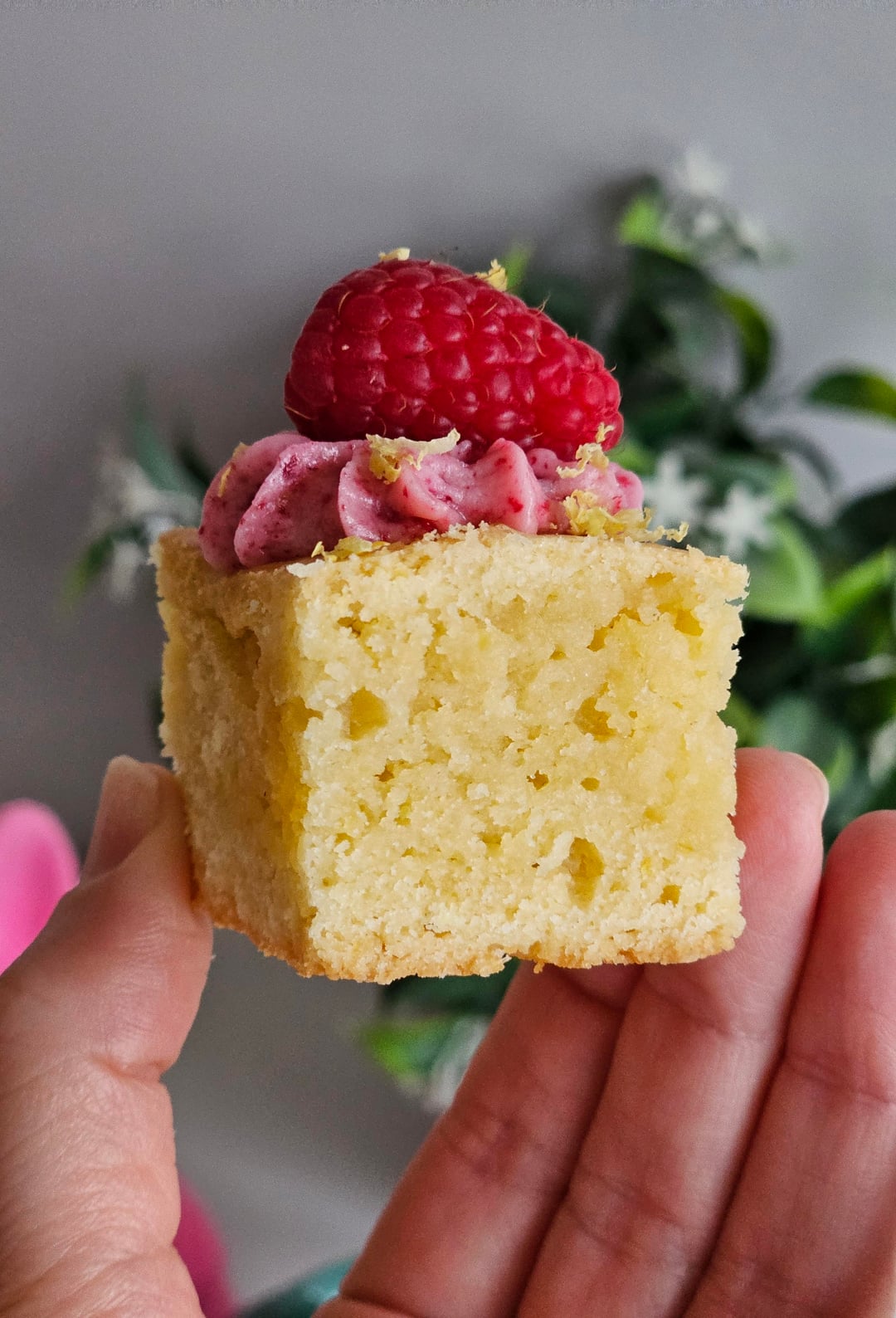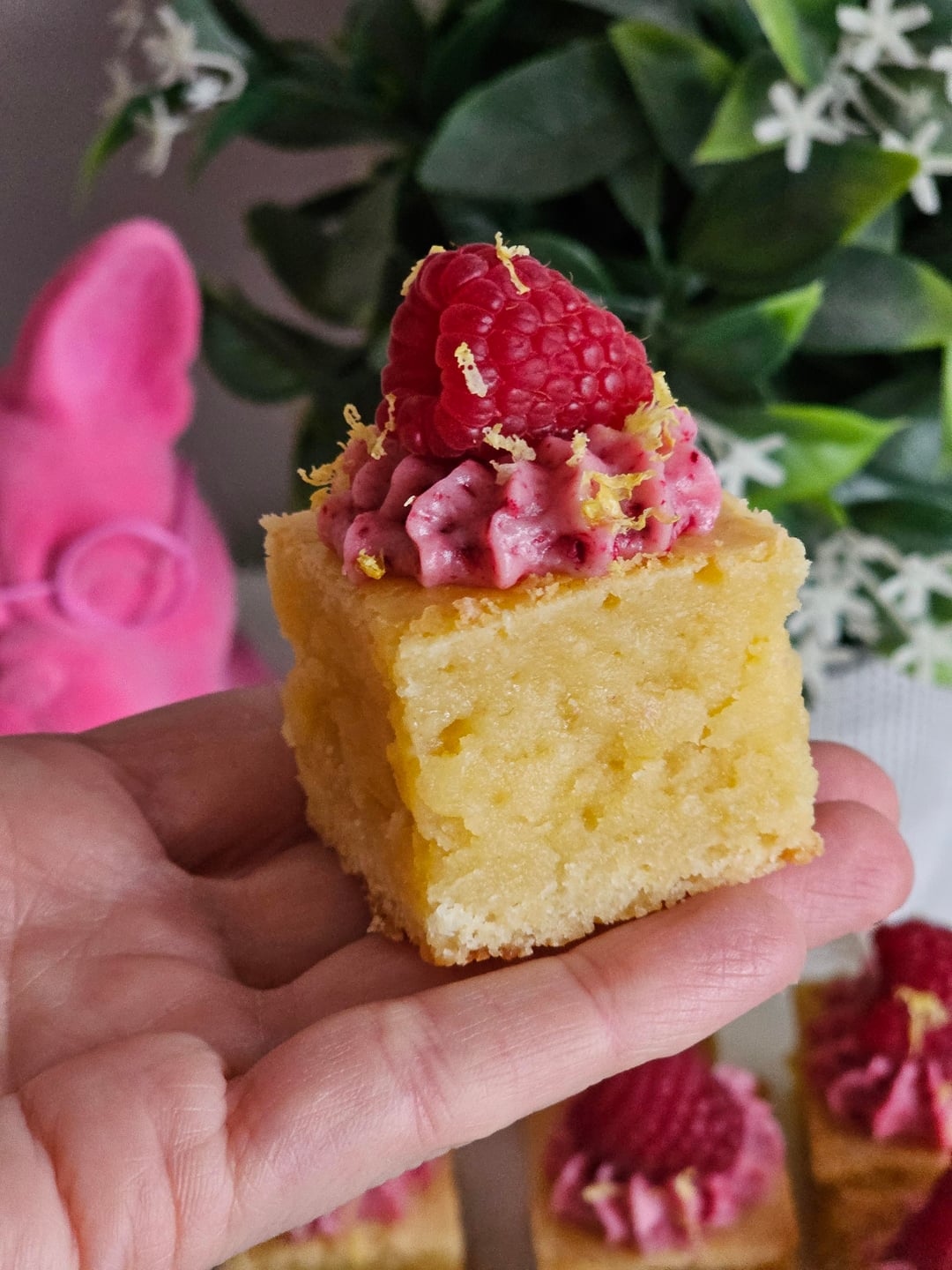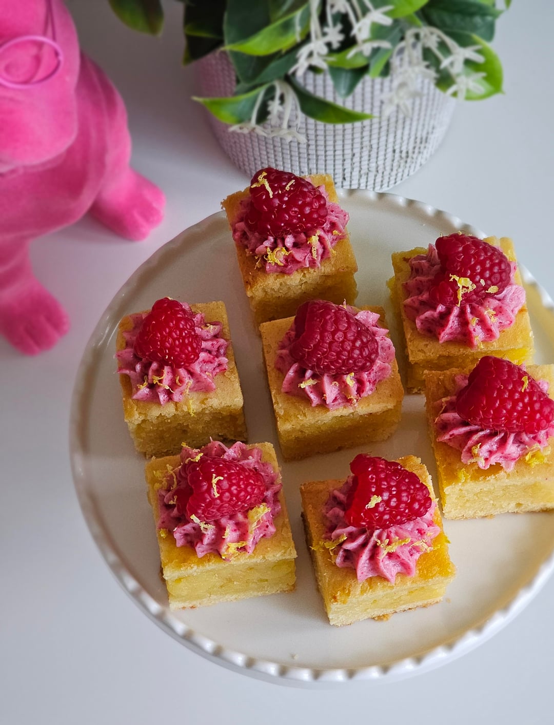 I call them lemon blondies. How did they get so tall? I thought this was cake before I read the title. But they look great! I like the colour contrast with the pink and red.