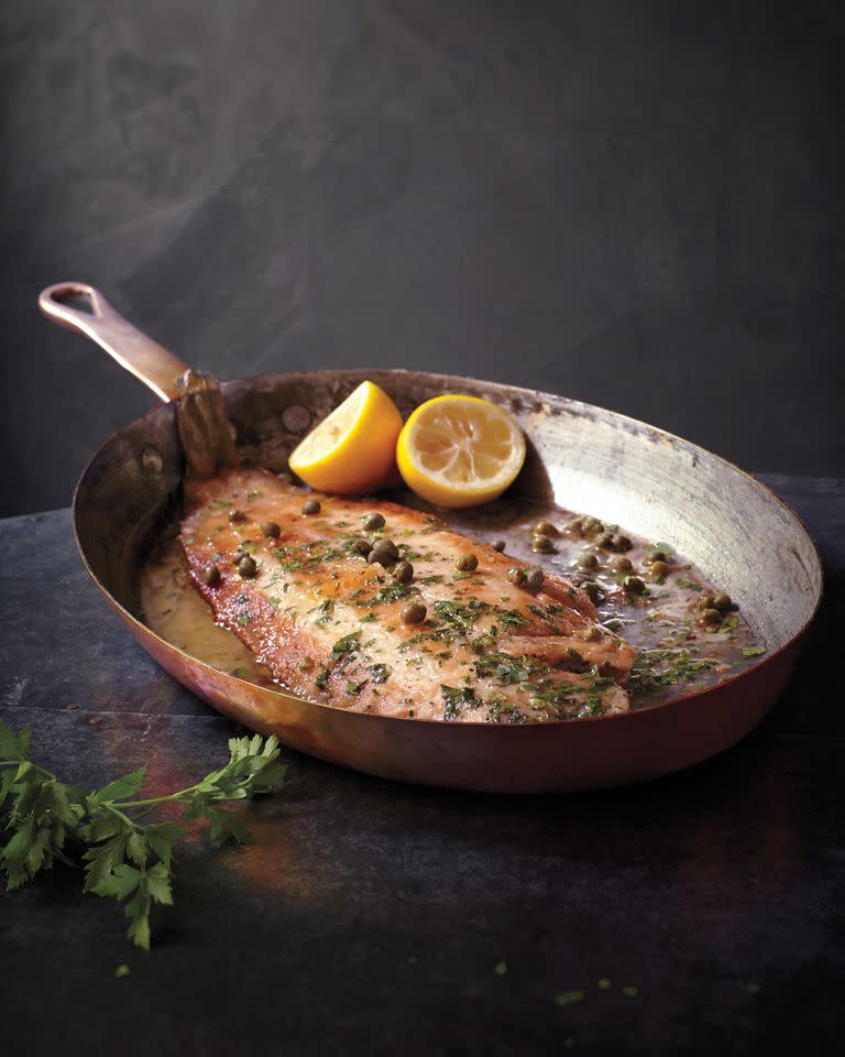 A true classic, sole meunière is also a simple dish made with whole Dover sole lightly dusted in flour and cooked with butter and oil. The fish is served with beurre noisette, brown butter with lemon, parsley, and capers.