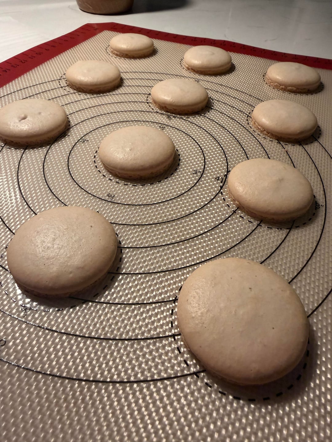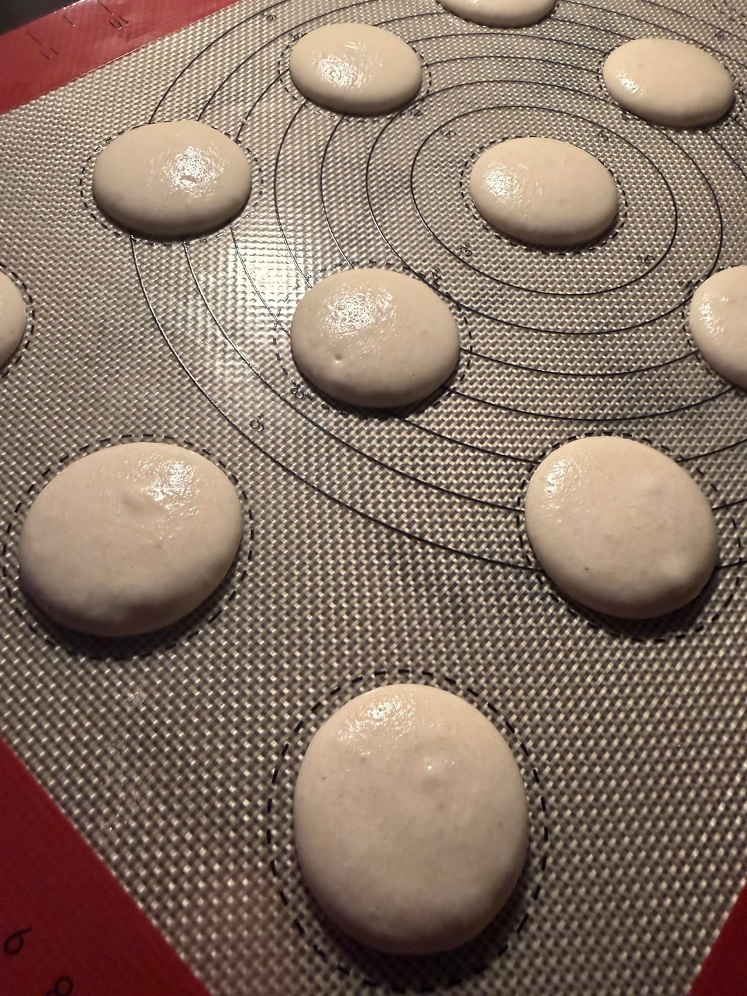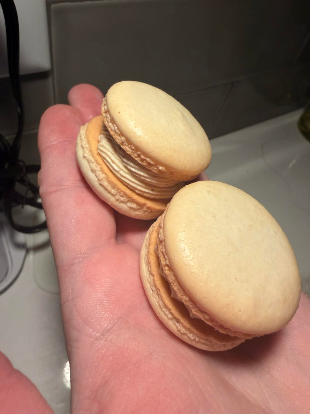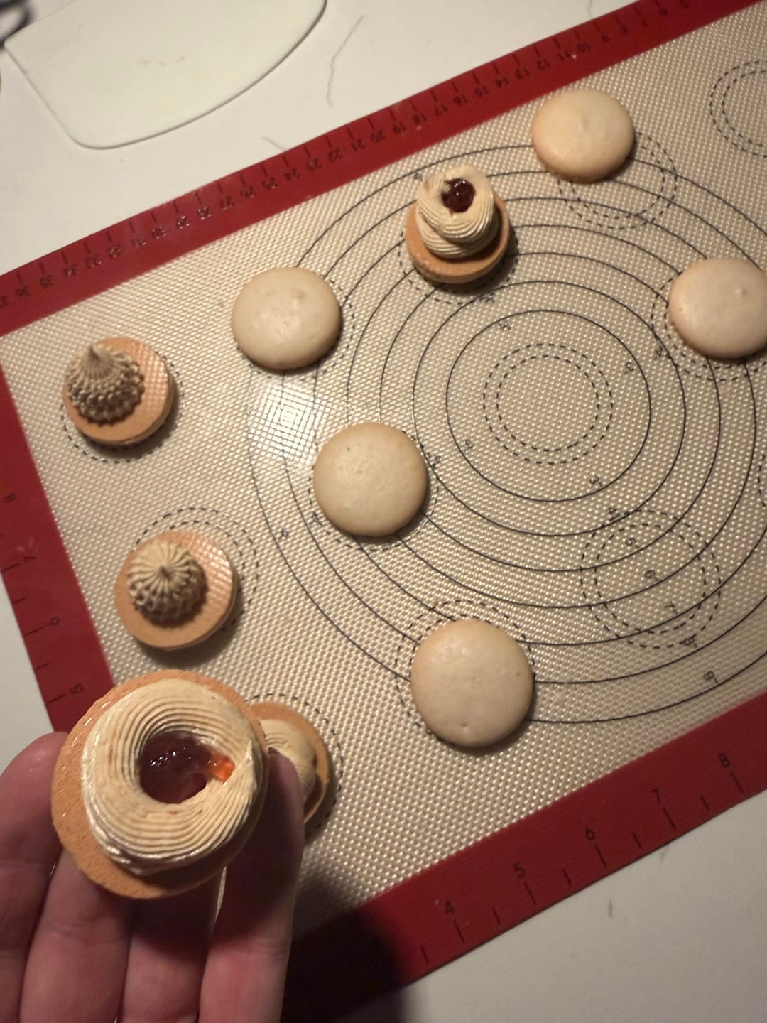 Third time making macarons. Added some peanut butter to my butter cream then dolloped some strawberry preserves in the middle 😊