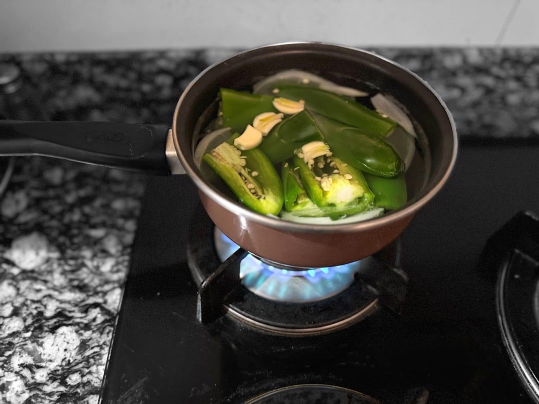 1.- Boil jalapeños, onion and garlic. You can add a pinch of salt and a knorr suiza if you want.