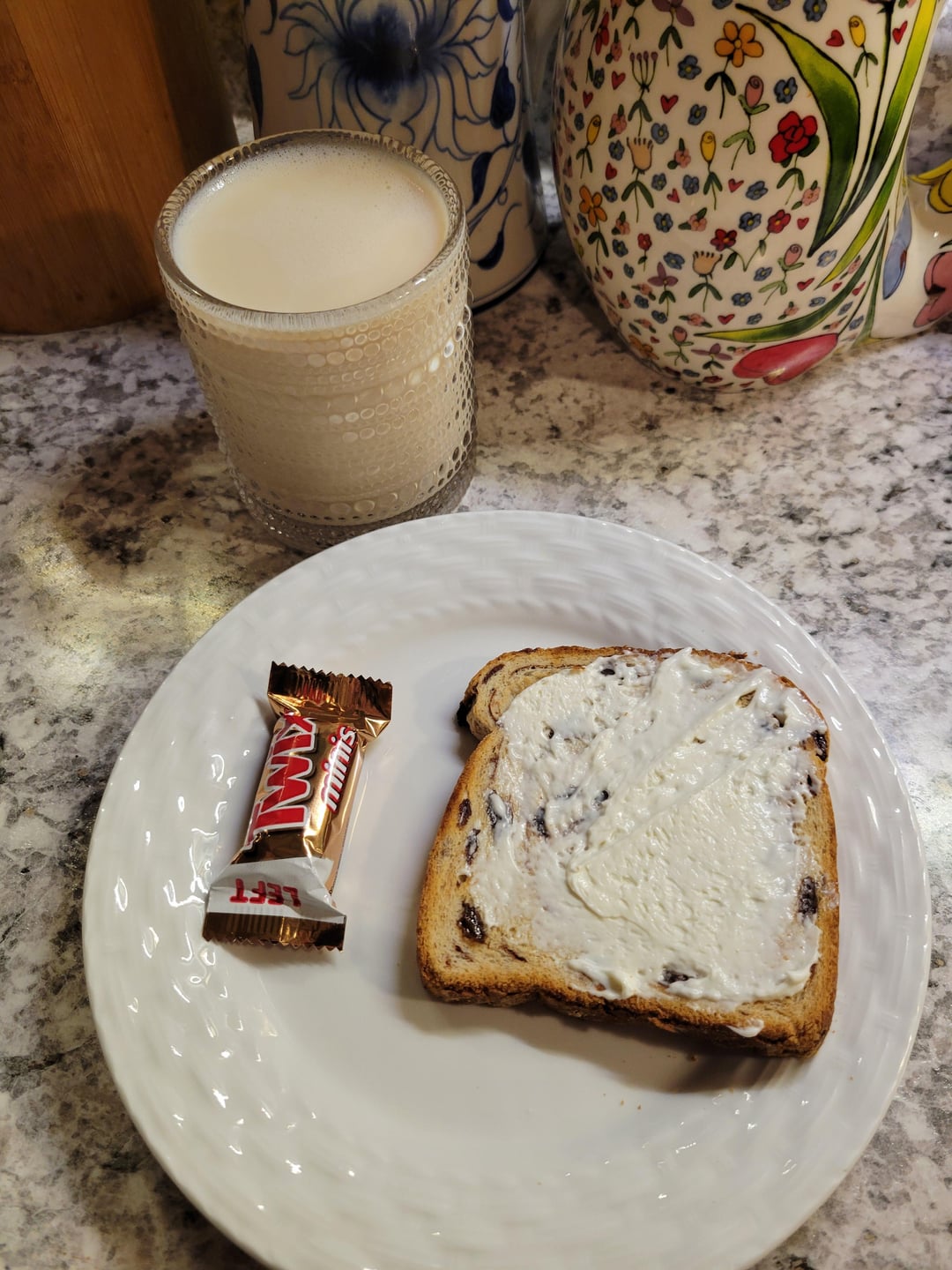 Snacks: Protein shake, cinnamon raisin bread with cream cheese, mini Twix – 331 calories, 32.8g protein