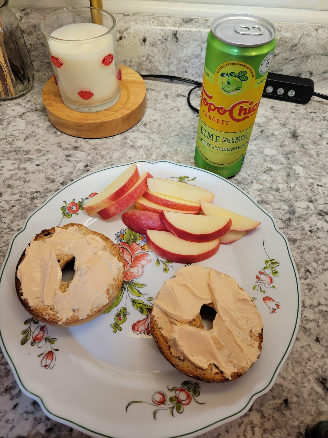 Lunch: Protein bagel with smoked salmon cream cheese, apple slices, Topo Chico – 234 calories, 18.9g protein