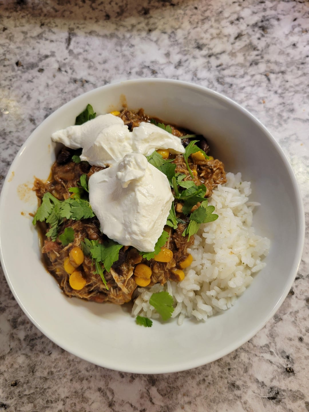 Dinner: Homemade salsa chicken with black beans and corn, sour cream, rice – 355 calories, 27.1g protein