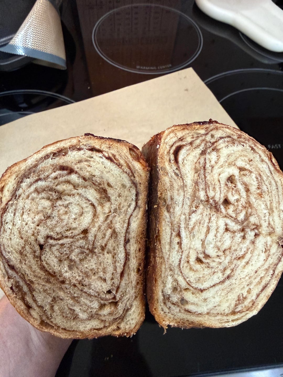 Recipe: 400g flour, 100 starter, 320 water, 20g honey and 8g salt. Added a ton of brown sugar and cinnamon at stretch and folds (bad idea). Baked in a loaf pan covered for 28 minutes, removed the lid and dropped temp to 400 until internal temp was 205.