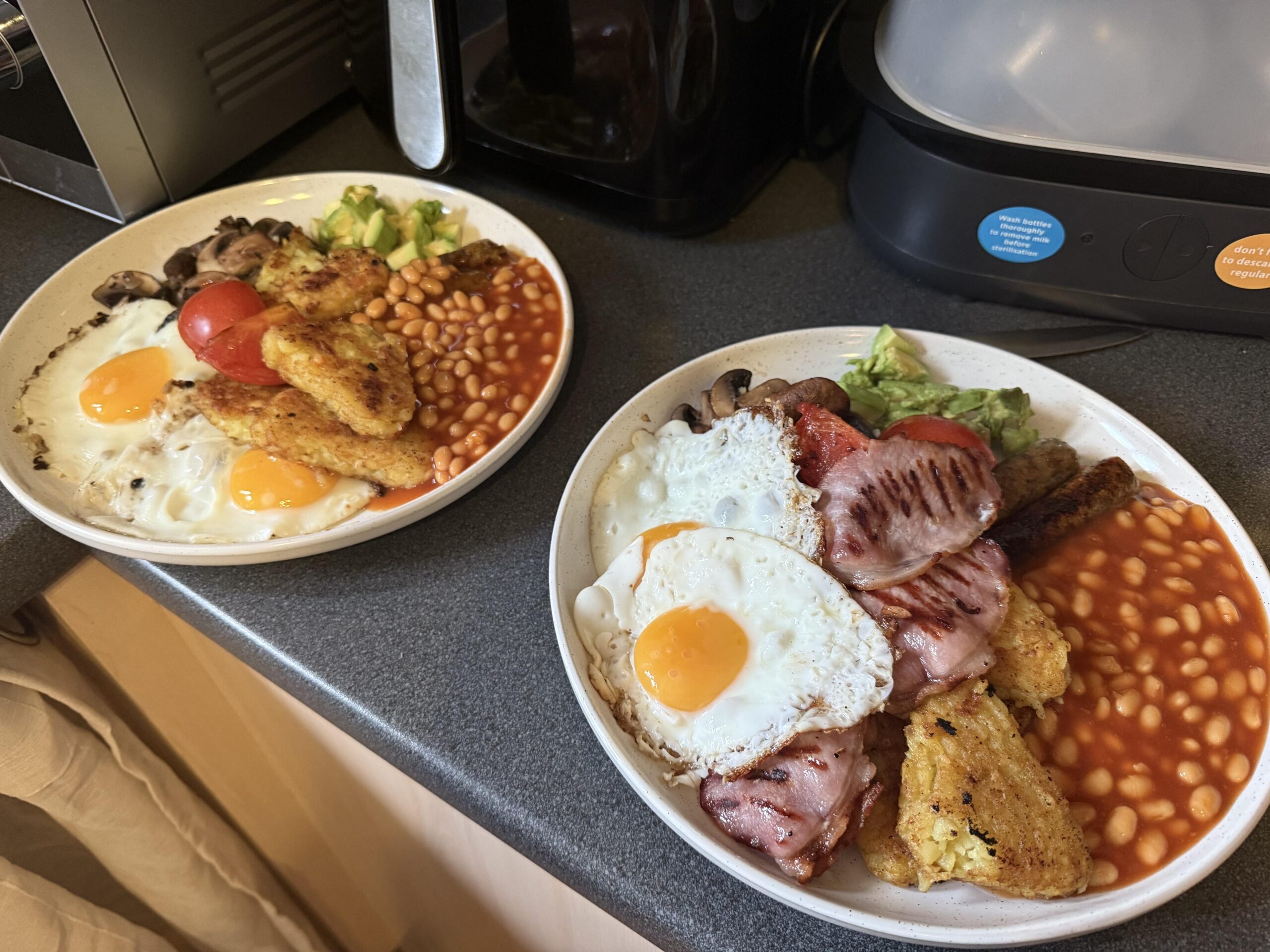 Veggie for me, bacon for my partner. Garlic butter mushrooms, trying to get the healthy fats in with the avocado. My partner gave 8/10, minus points for the avocado and veggie sausages 😅 by philsrice Dining and Cooking