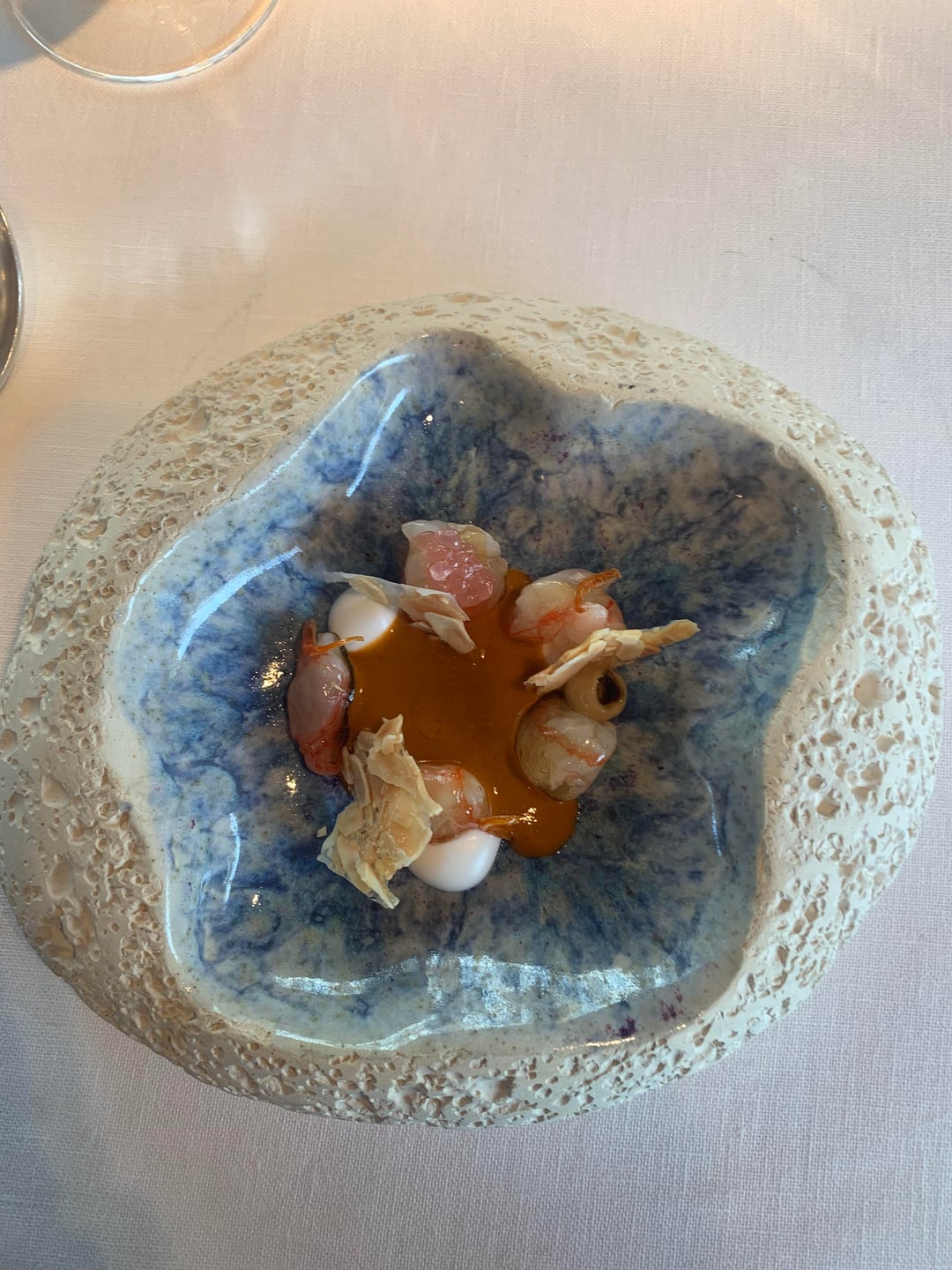 • Crustacean velouté with caviar: the first example of deep, rich flavour in a small bite without being overwhelming;