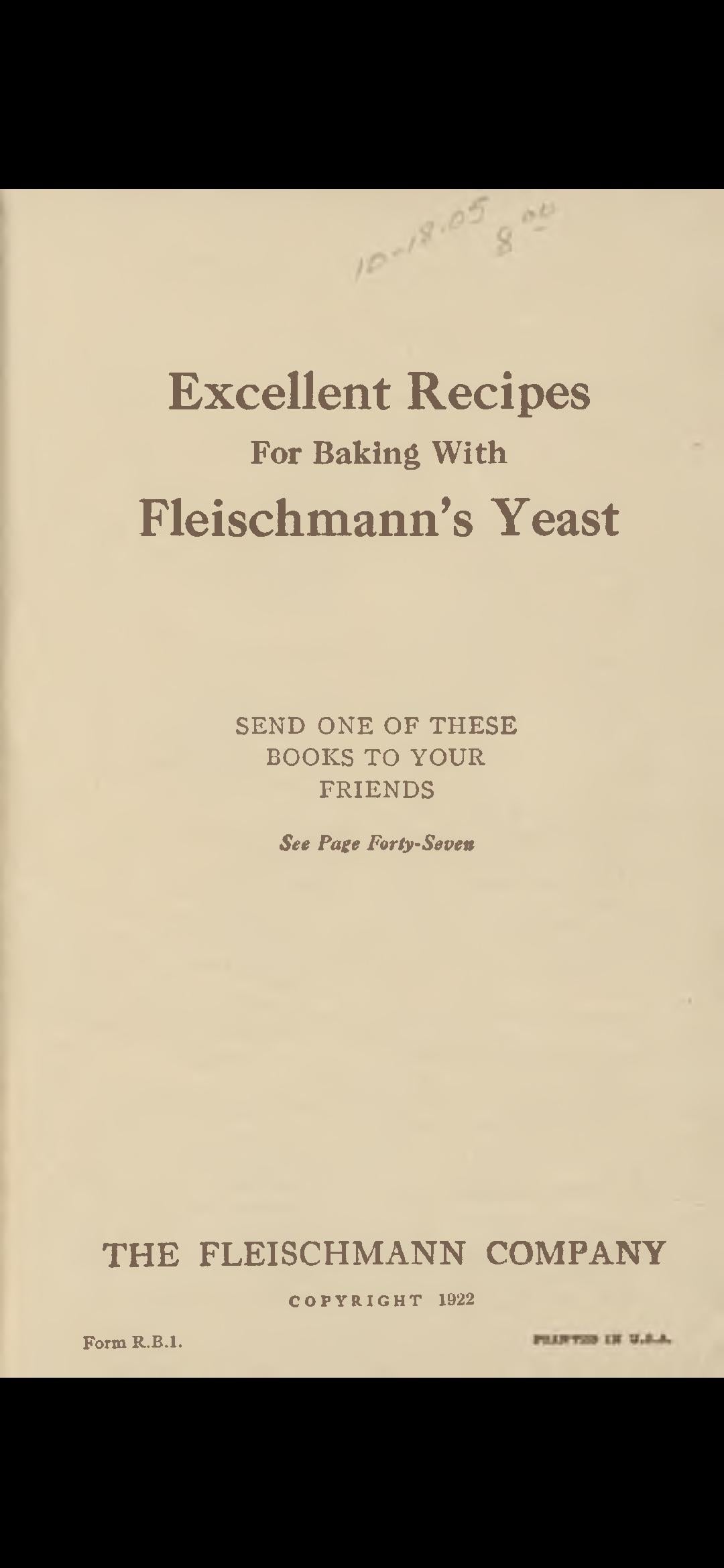 MSU [Michigan State University] has an extensive antiquarian cookbooks held in America. They have an ebook copy of Fleischmann's Recipes(1922) – .