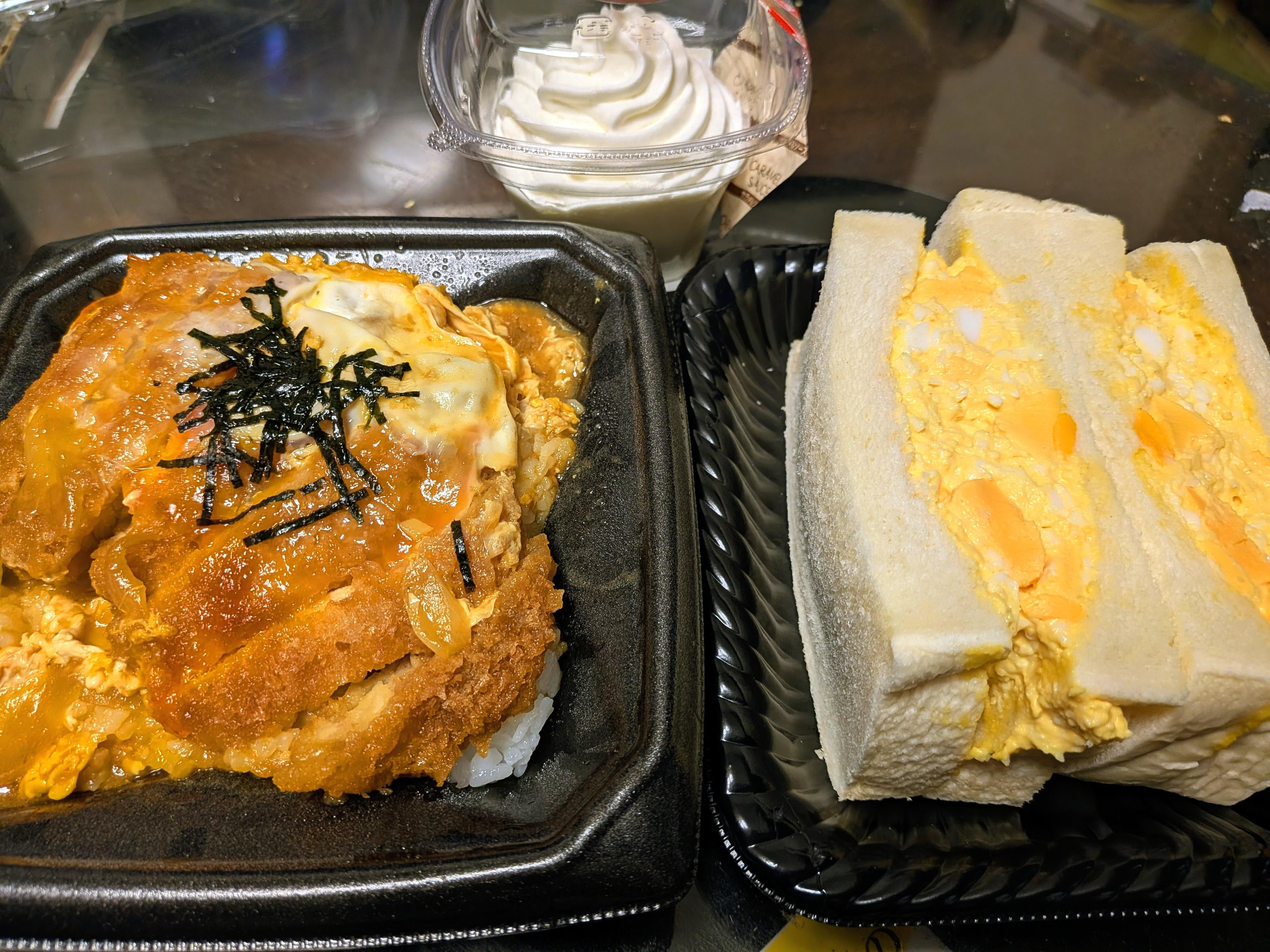 Katsudon was ¥299, tamago sando ¥199, and dessert ¥199.