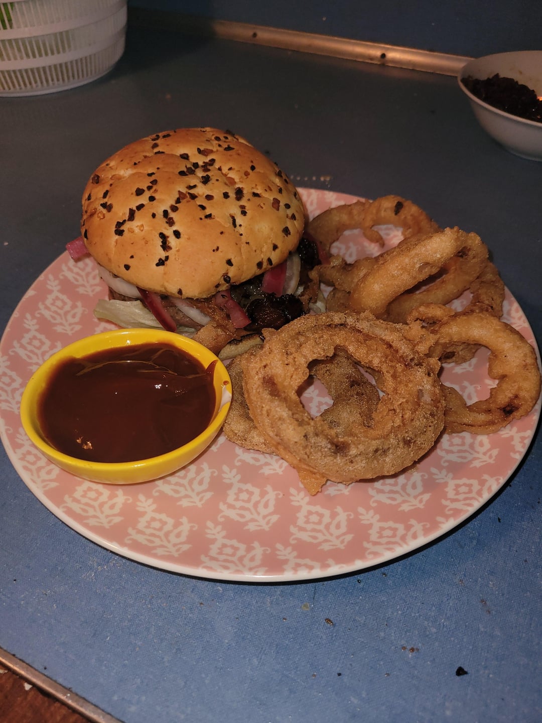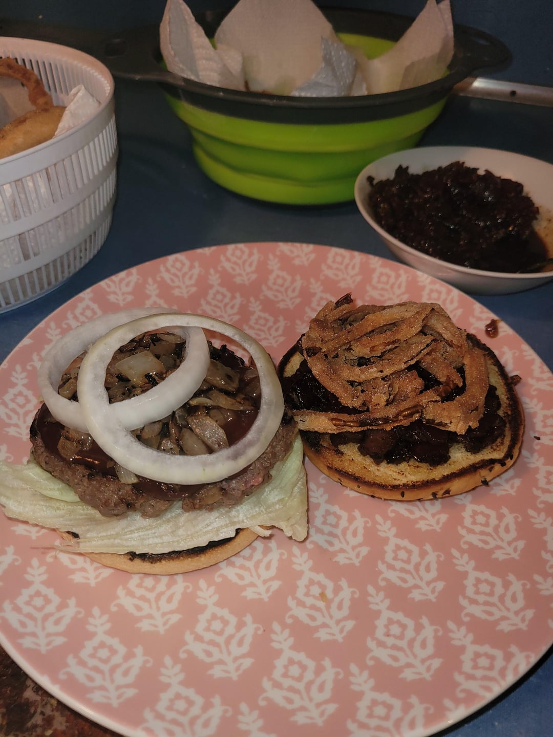 A 80/20 chuck patty with grated onion, topped with fresh onion, grilled onion, onion straws, pickled onion, and bacon onion jam… all atop an onion bun. Served with a side of onion rings, naturally.