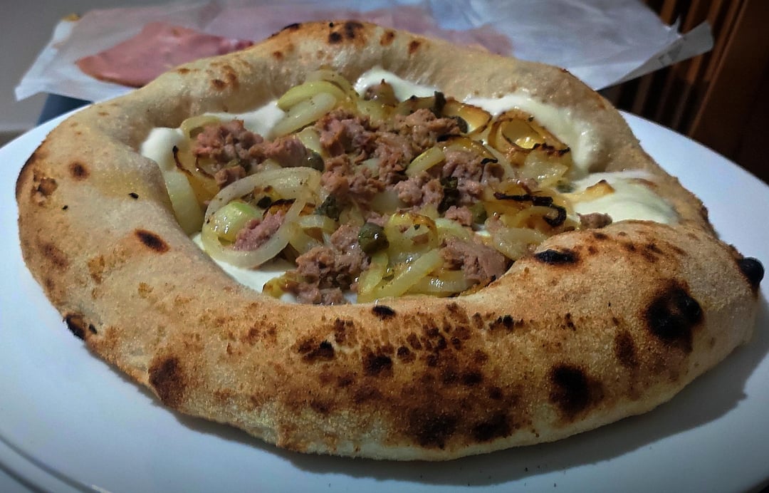 Una bianca tonno, cipolla, mozzarella pugliese e peperoncino l'altra pomodoro mozzarella salsiccia piccante e olive.