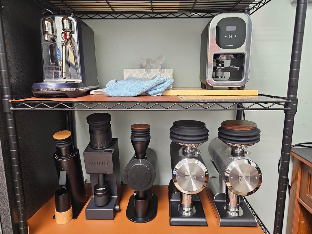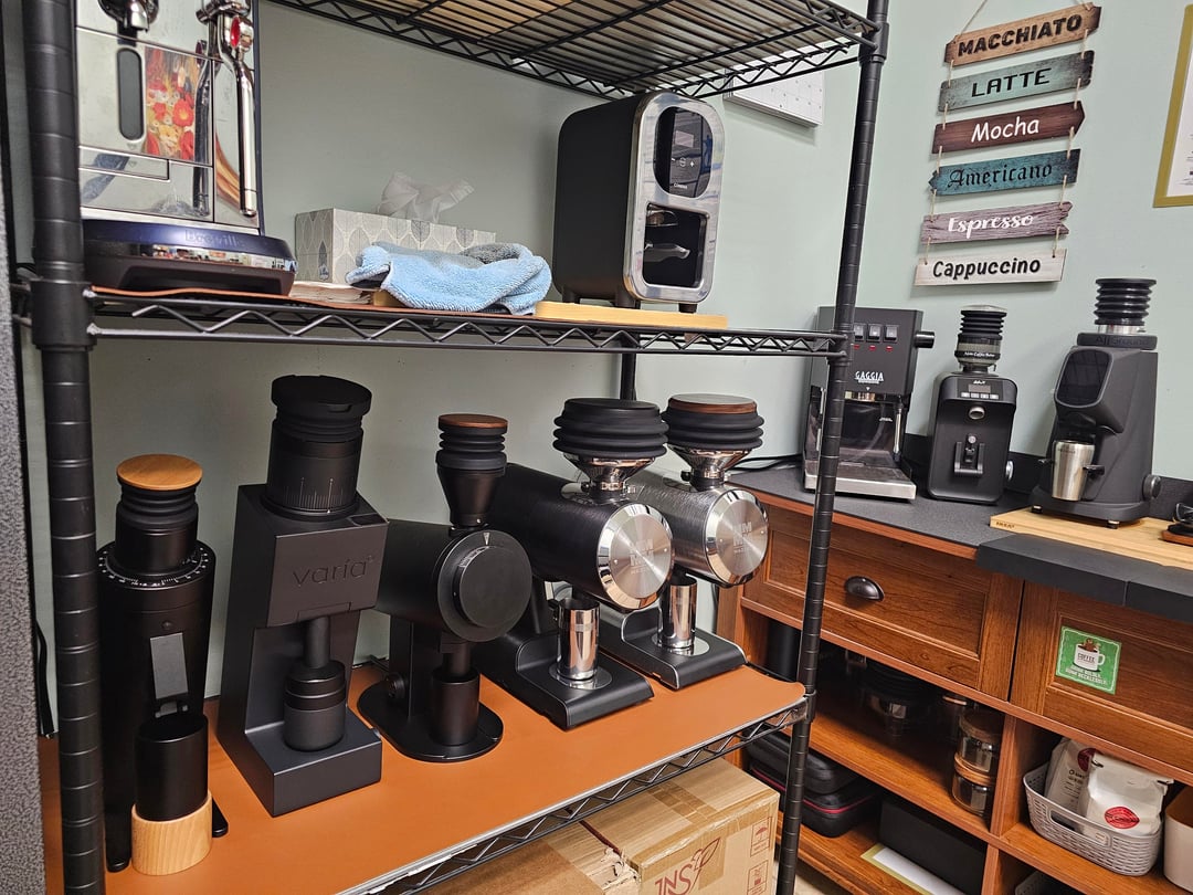 Such a nice collection of grinders but the vibe is in shambles with that cheap live-laugh-love-esq coffee sign on the wall