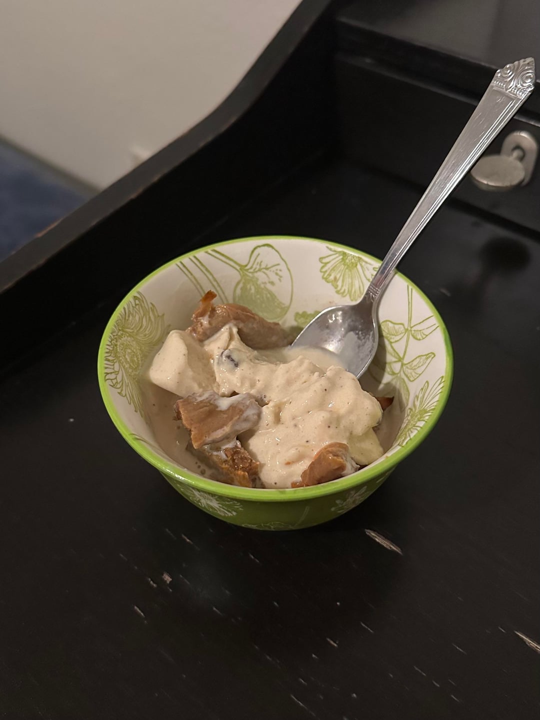Dessert: peanut butter protein ice cream ~recipe~ with a protein peanut butter chocolate chip cookie ~recipe~ (198 calories, 22g protein)