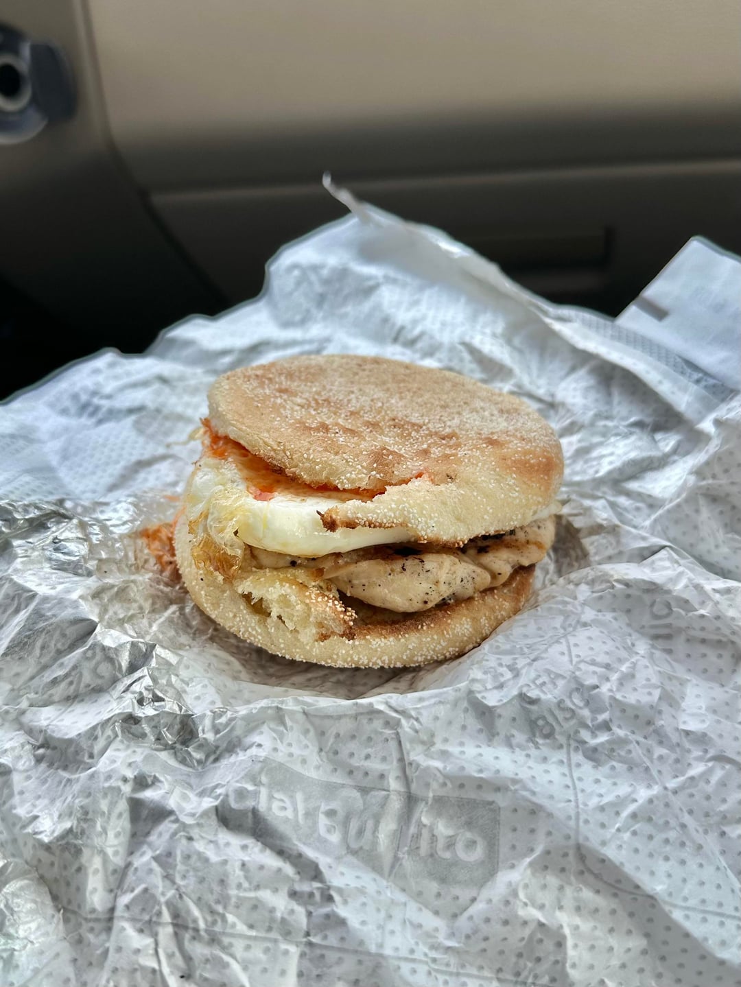 Breakfast: Chick-fil-A egg white grill no cheese with hot sauce, and a not pictured mushroom coffee with almond milk (290 calories, 27g protein)