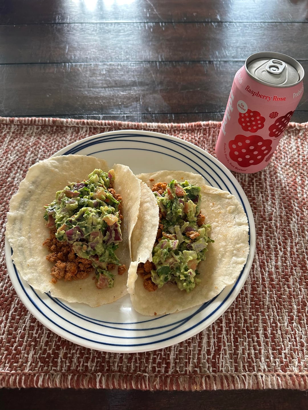 Dinner: ground turkey tacos with Siete almond flour tortillas and homemade guacamole, and a Poppi raspberry rose prebiotic soda (484 calories, 28g protein)