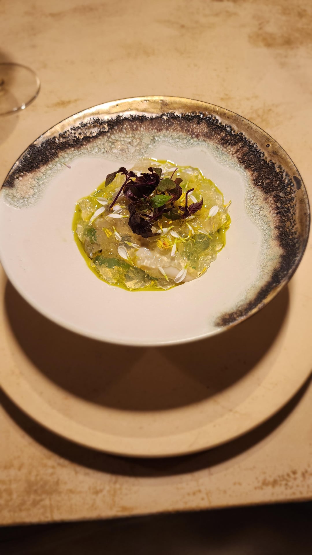 Oysters with shiso gel. Lovely acidity running through the dish to help balance out the saltiness of the oysters. Though while the flavor was good, I felt having so much gel paired with oysters ultimately made for slightly too much of a slimy texture overall that the crunch of the vegetables couldn't quite combat alone.