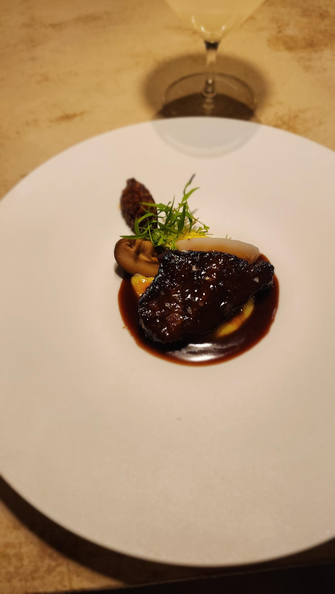 Wagyu beef cheek. This was really fantastic. What's not to love? Perfectly cooked beef with a sticky and delicate sauce. The Japanese mustard added a pleasant sharpness but was much more subtle than expected, in a good way. Only complaint was watching the guests next to us who got the more expensive tasting menu version with shaved black truffle which we couldn't afford.
