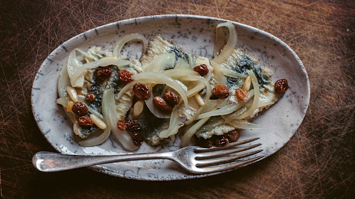Meanwhile, cook the onion gently in a frying pan with the olive oil just until it is soft and transparent, about 10 minutes on a low heat, then add the vinegar, the wine from the raisins (set the raisins aside), some freshly ground pepper and the spices, if using. Let it simmer gently for about 10 minutes, then remove from the heat. Taste the mixture; if it is too sharp, stir in a pinch of sugar.