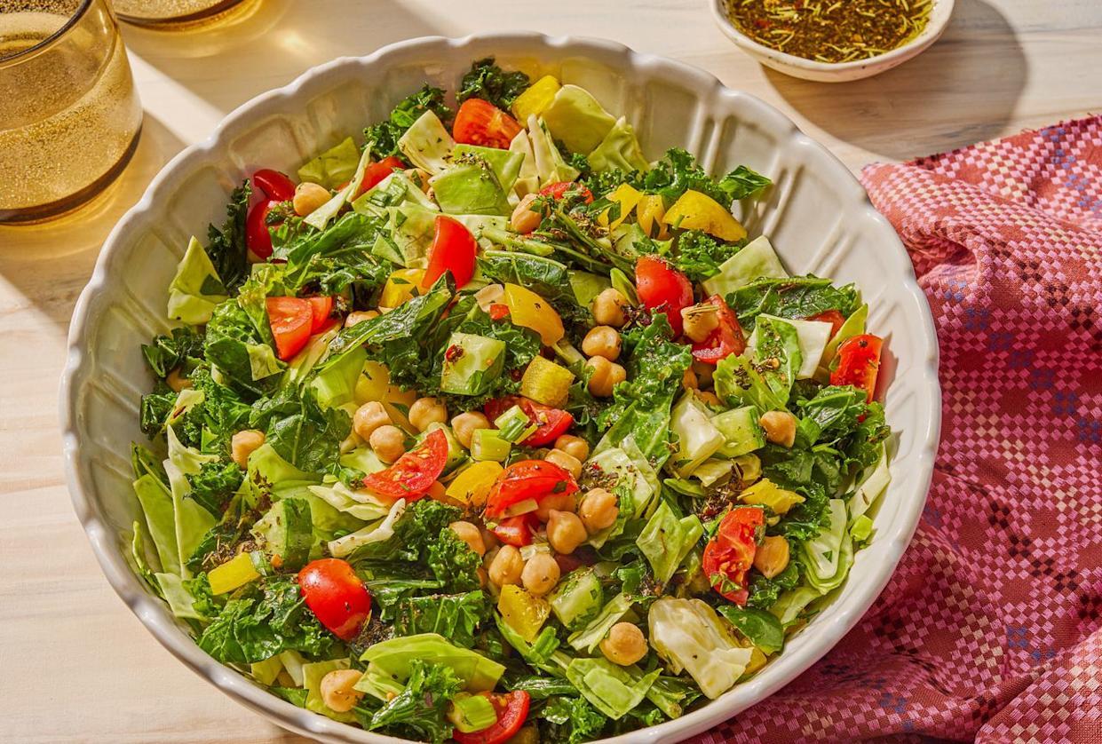 This chopped salad is a crisp, colorful mix of veggies. It’s tossed with a zesty homemade vinaigrette while chickpeas bring on the plant-based protein and fiber. Everything is chopped small for the perfect forkful every time.