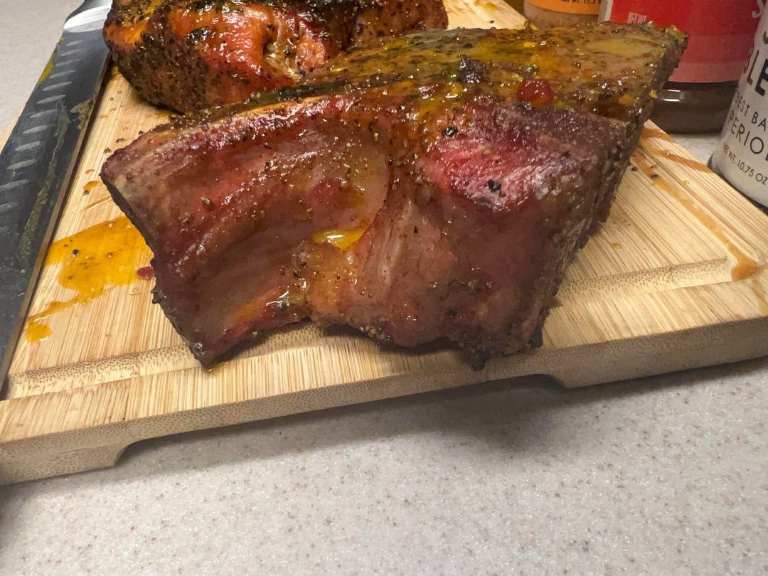 Finished direct over the coals to 145° internal, rested 10 minutes, then brushed lightly with a mustard-based sauce while it was still warm.