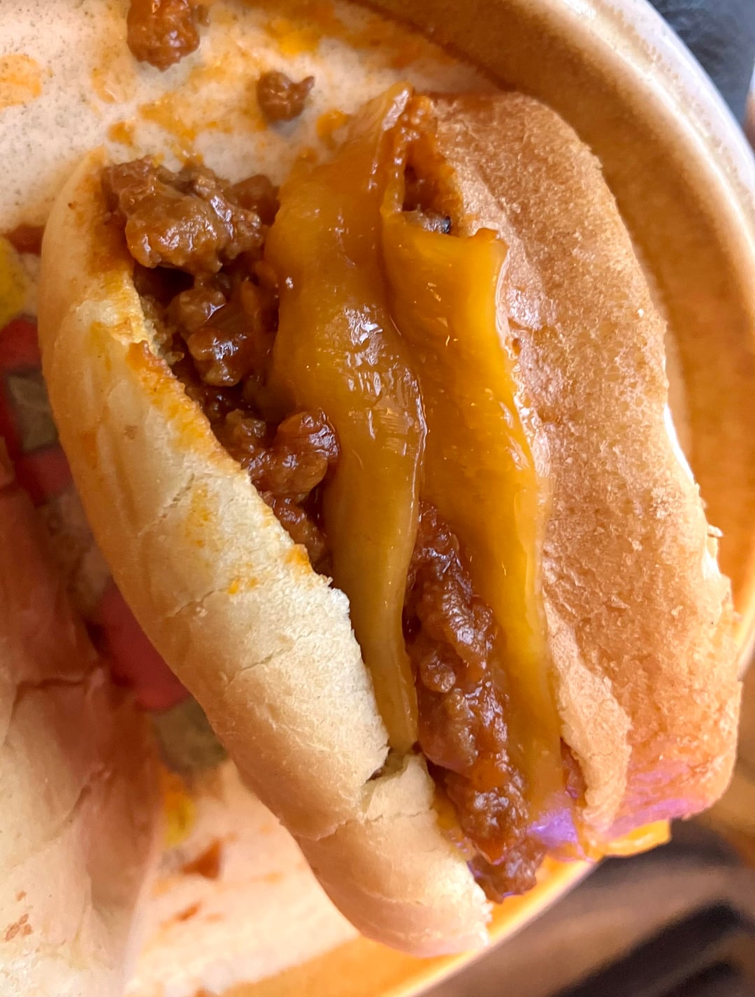 Ingredients: Browned ground beef, bottle of mustard and ketchup, cider vinegar, dried onion bits, garlic, cumin, chili powder, salt, pepper, and a touch of cayenne pepper.. crockpot simmered for 8 hours on low with careful stirring. Served on a hamburger bun with melty cheese and cut in half. Spoon required