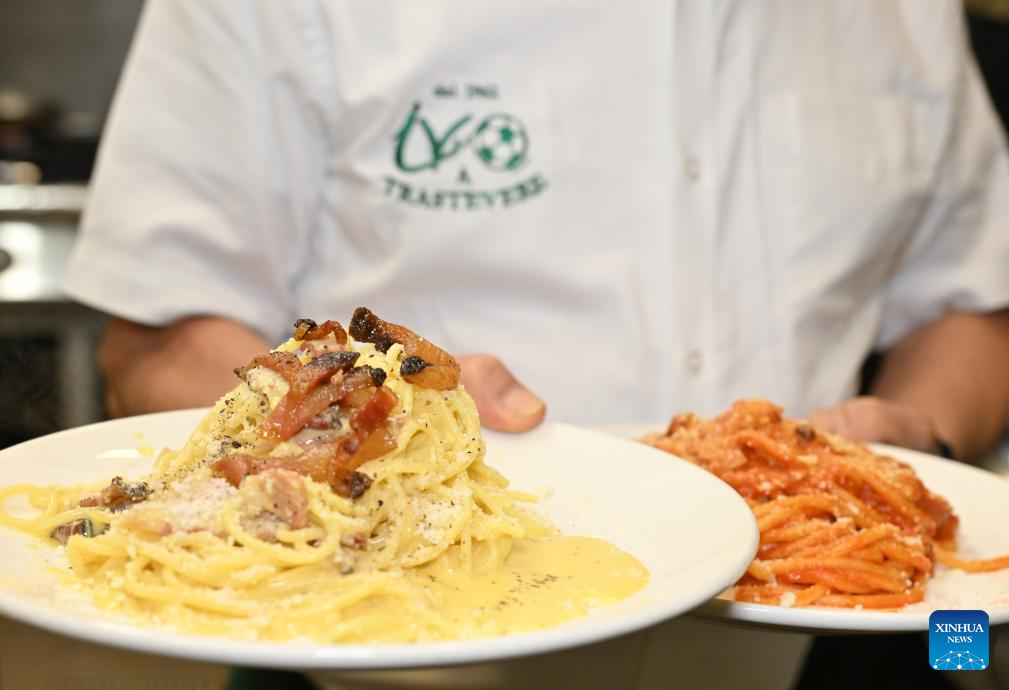 This photo taken on Dec. 11, 2025 shows Spaghetti alla carbonara (L) and Bucatini all’amatriciana at a restaurant named Ivo a Trastevere in Rome, Italy. (Photo by Alberto Lingria/Xinhua)