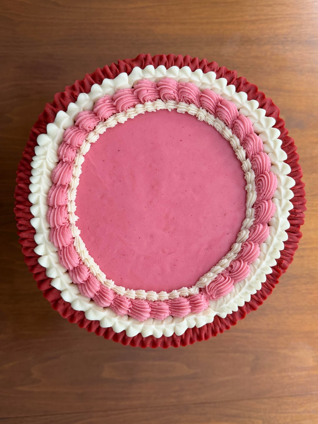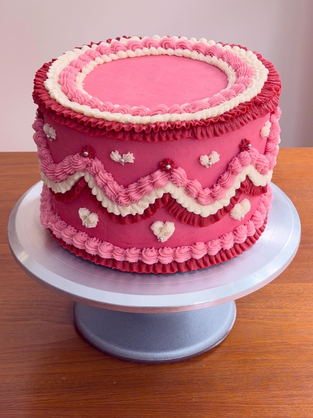 Second time trying a vintage style cake. It’s a chocolate cake filled with raspberry filling and whipped chocolate ganache and frosted with raspberry buttercream.