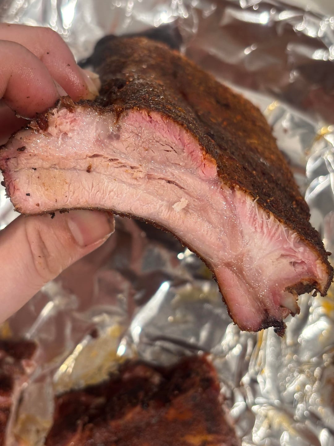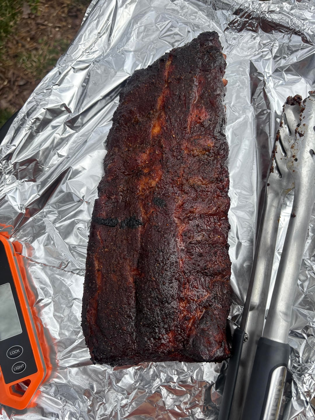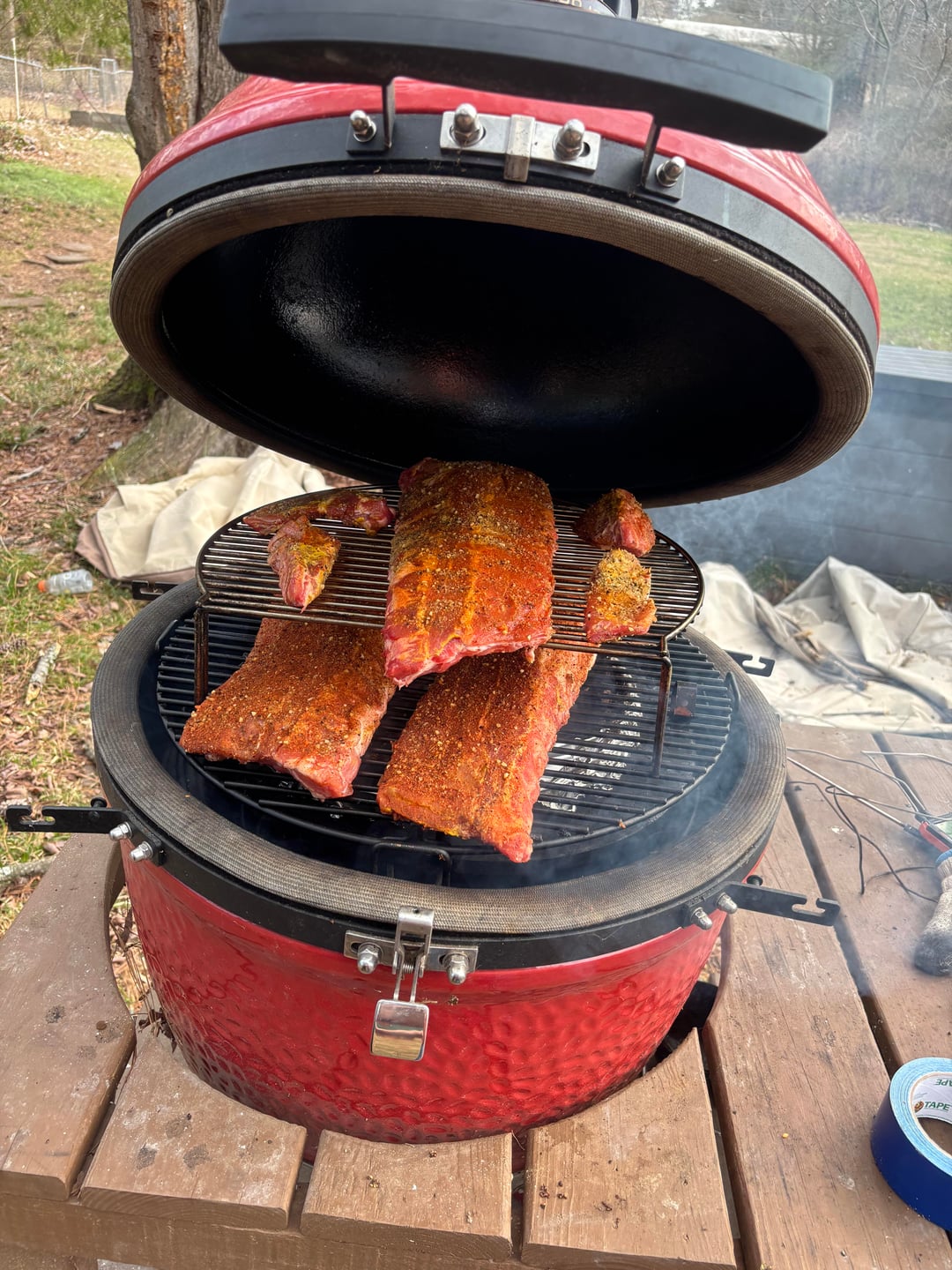 Put on my Kamado joe for 2 hours of smoke. Wrapped with brown sugar, butter, and honey for 1 hour, then set back on the smoker for thirty minutes or so with one more layer of rub.