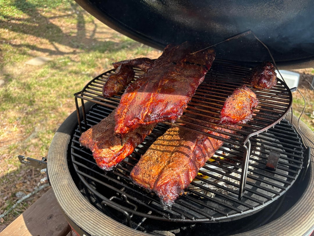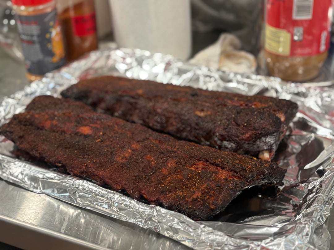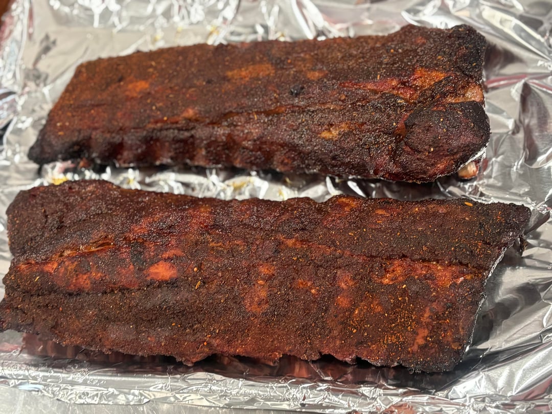 I smoke three baby back ribs, with two of them my Memphis Style BBQ and one Honey BBQ. Both had a base layer rub of Mrs. Dash Garlic and Herb spice.