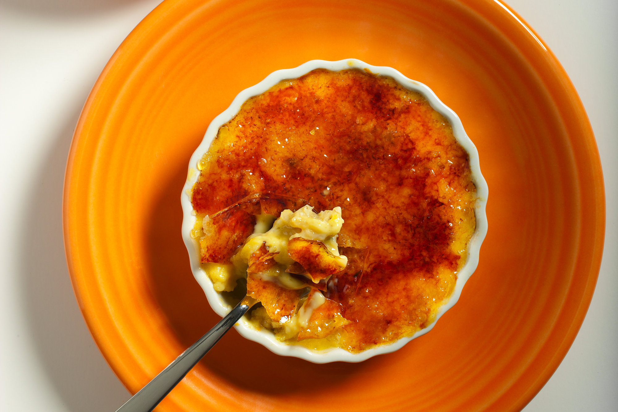 - When ready to serve, evenly sprinkle each ramekin with about 1 tablespoon granulated sugar. Using a kitchen torch or under very hot broiler, carefully caramelize sugar until amber brown. Serve immediately or chill again, uncovered, up to 4 hours.