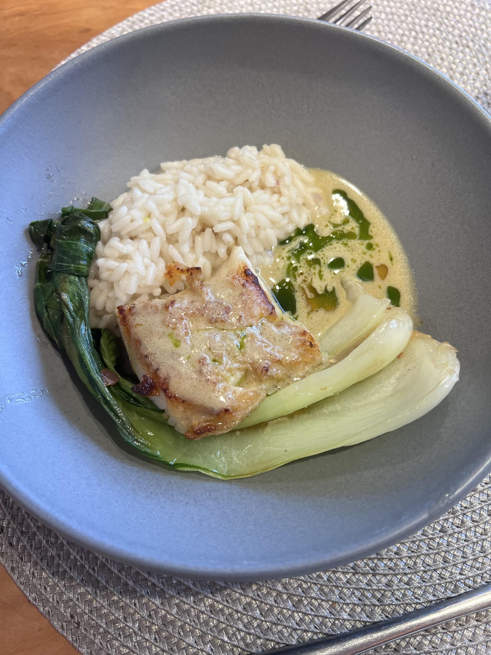 halibut, green curry, sunchoke risotto, blistered bok choy