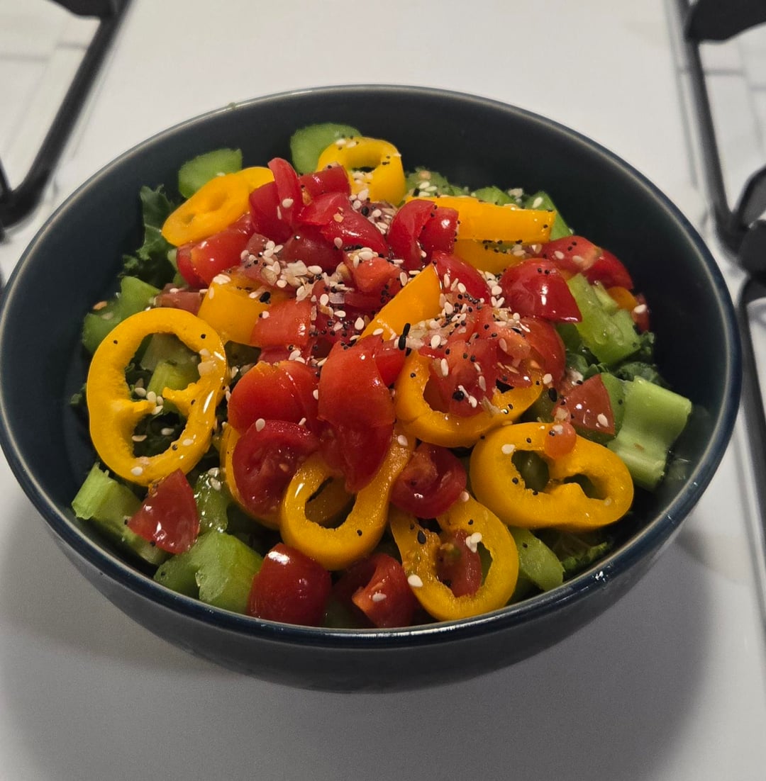 My giant salad i have every night for dinner. I always have it with a side of protein like fish or chicken. It has seriously helped my energy levels and brightened my skin. It's kale, peppers, tomato, celery, everything bagel seasoning, and 2 tablespoons of avocado oil.