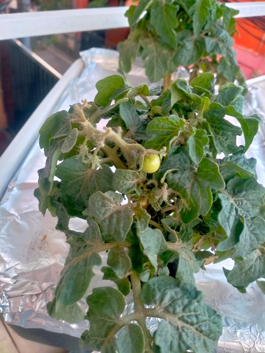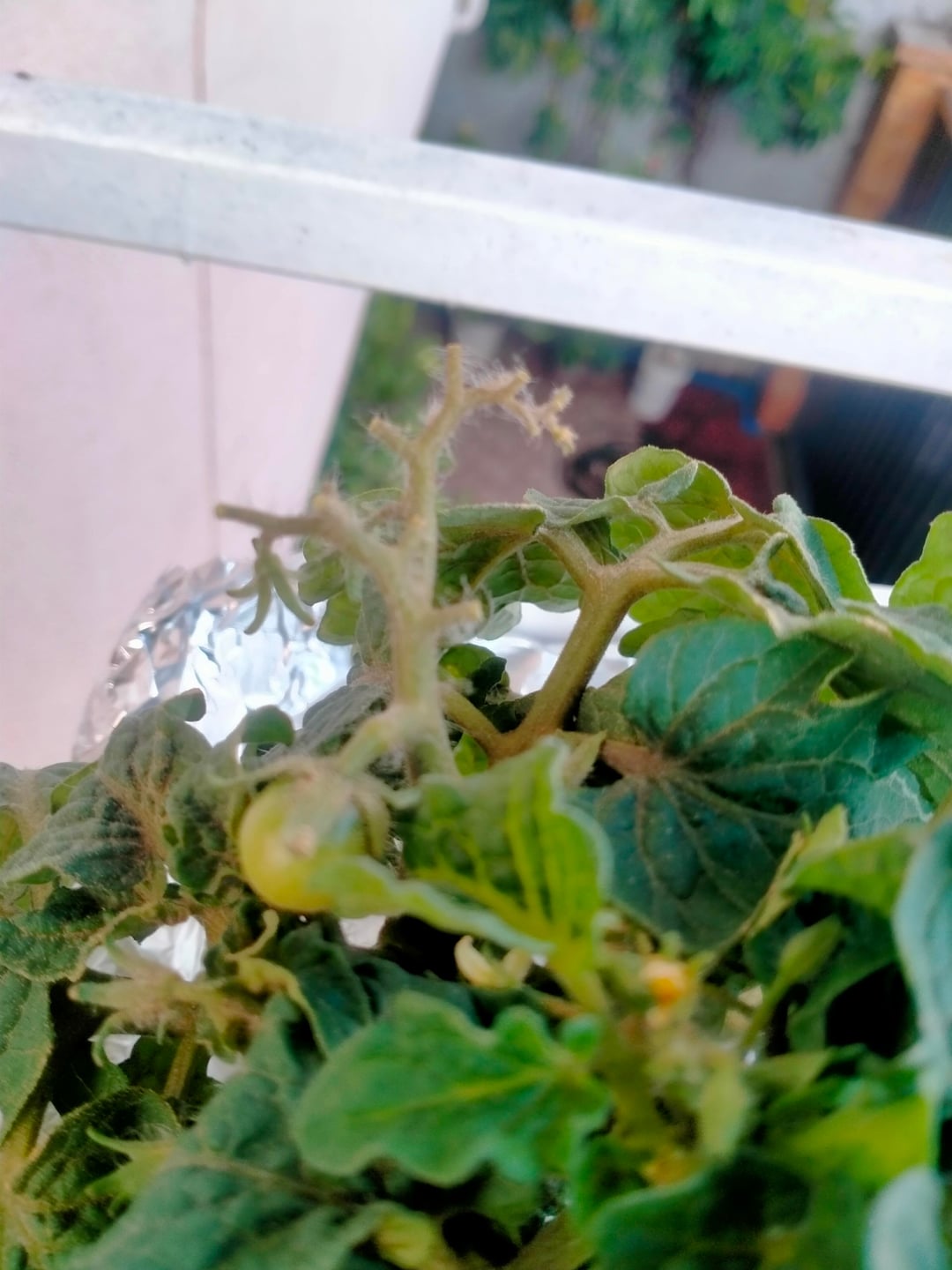 Hello! I need help. I have this tiny tim tomato in a kratky setup. The top seemed turing brown, particularly the stem where the flowers are.