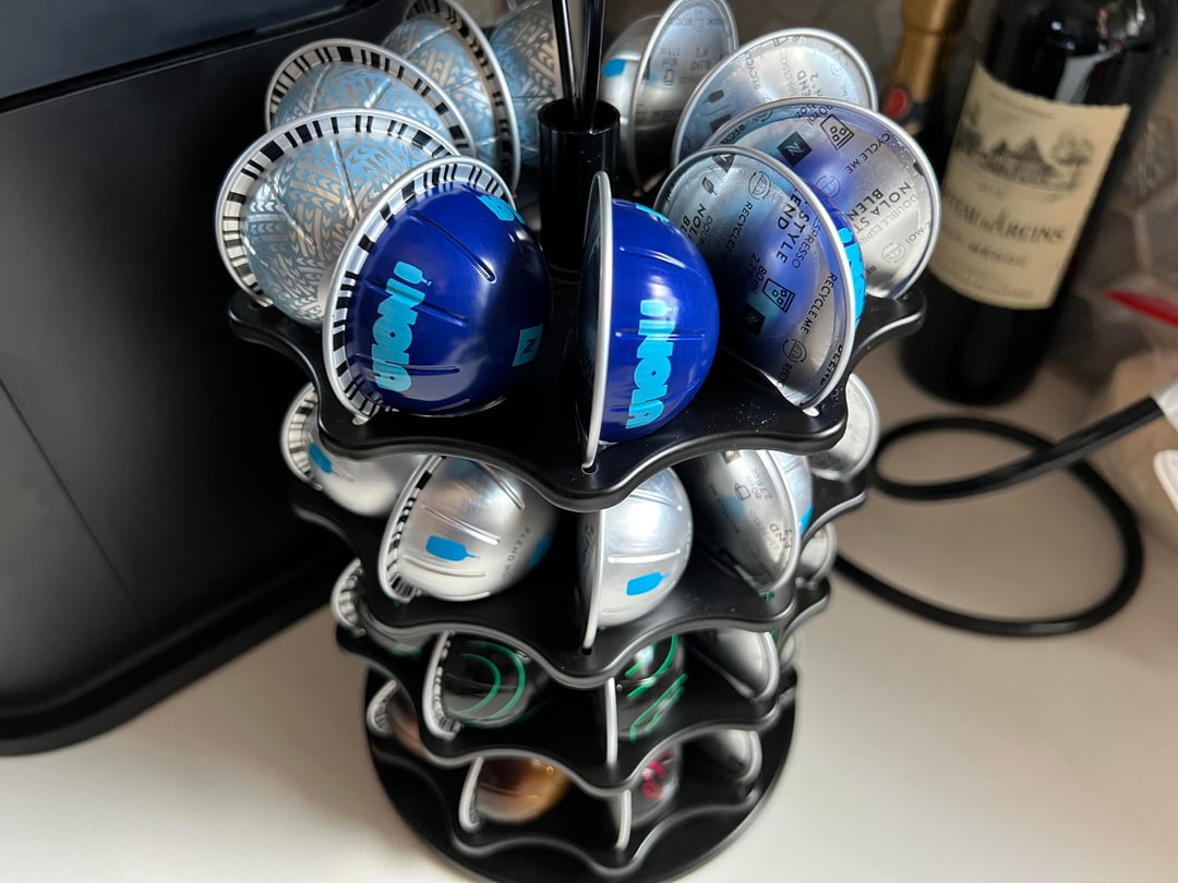 Kinda wish I got the bigger version. I didn’t know I will have so many Nespresso cups per day. I try to have the rows fully stacked with one blend, but I opened an online order today and wanted to have all the blends on there. 😻 Hence the non-uniformity.