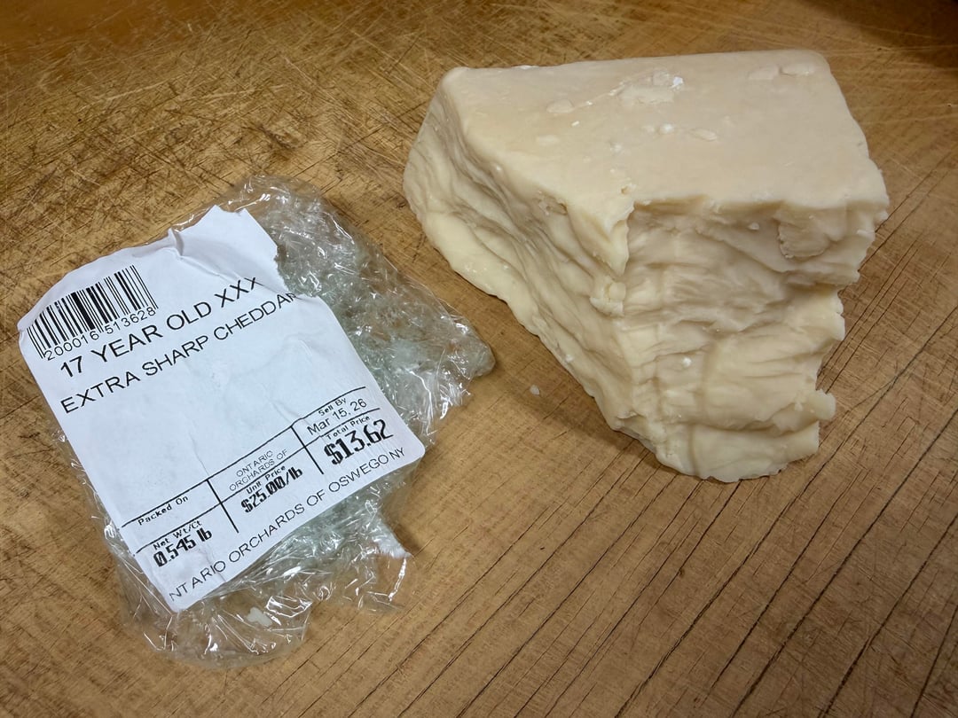 I got some 17 year aged “XXX” sharp cheddar from my favorite local farm stand, have been enjoying it. It definitely quite sharp but very pleasant, crumbly but still a little creamy when eating, and has a good amount of calcium citrate crystals. I posted about some even older (maybe) cheese I got from the same place last year and a few folks cried foul, but the owner of the farm stand says they get their aged cheese from a central New York supplier who has been in the business a very long time. Plausible? Either way it’s good!