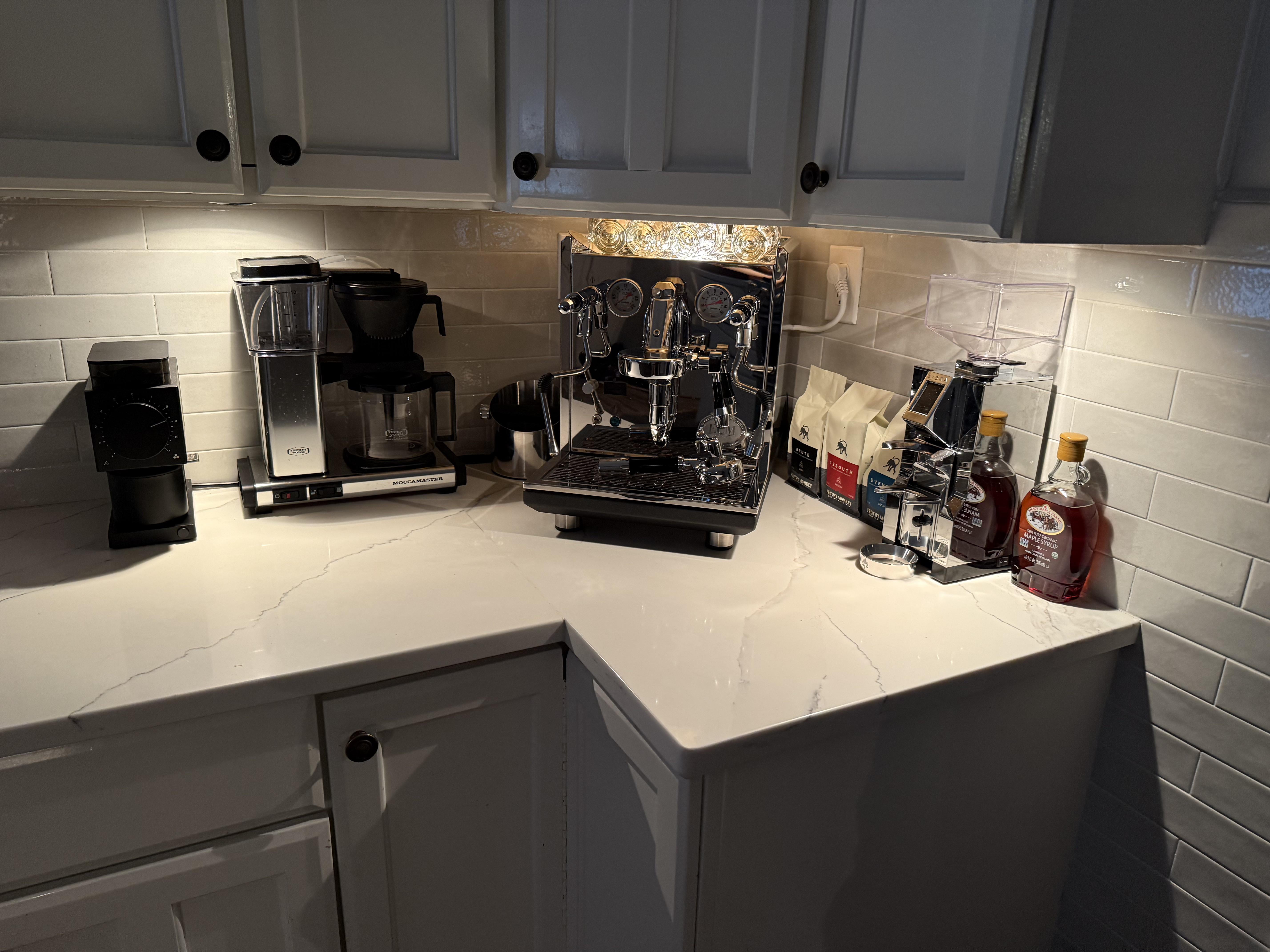 Looks like my kitchen—Pourover stuff, couple scales, Moccamaster, Eureka Grinder, Turin Legato V2, portafilter baskets, dosing funnel, cleaning stuff, hot water dispenser, espresso cups, mini vacuum.